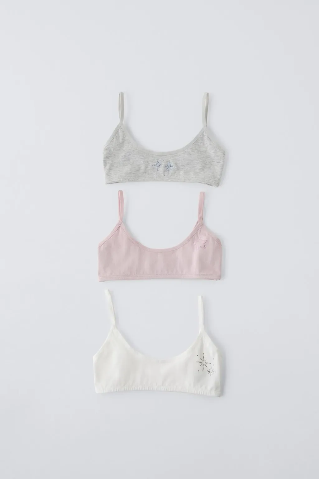Pack de tres tops con cuello redondo y tirantes ajustables. Detalle strass en delantero con diferentes formas.