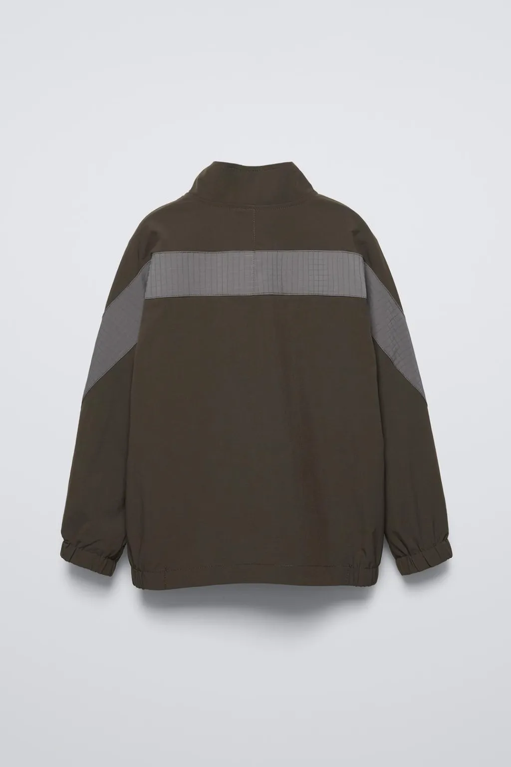 Canguro con cuello subido y manga larga acabada en goma. Cierre con cremallera en canesú. Estampado en pechera. Detalle tejido a contraste en mangas. Tejido interior con rejilla.