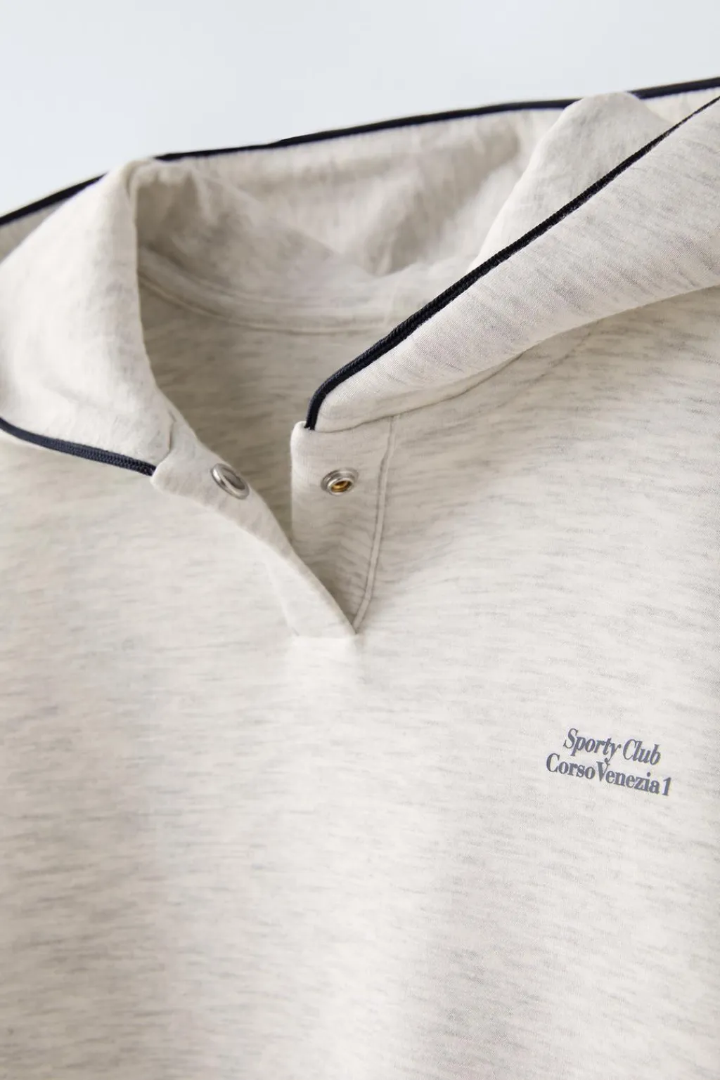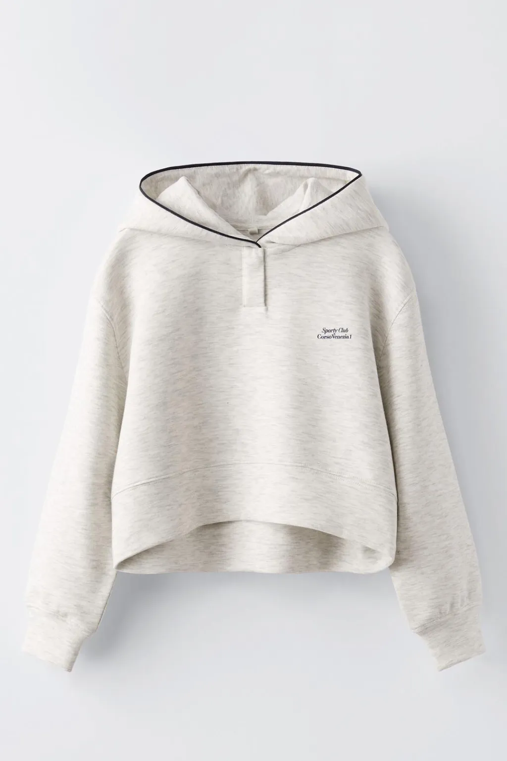Sudadera con capucha y manga larga. Cierre con botón oculto en canesú. Estampado texto en pechera.