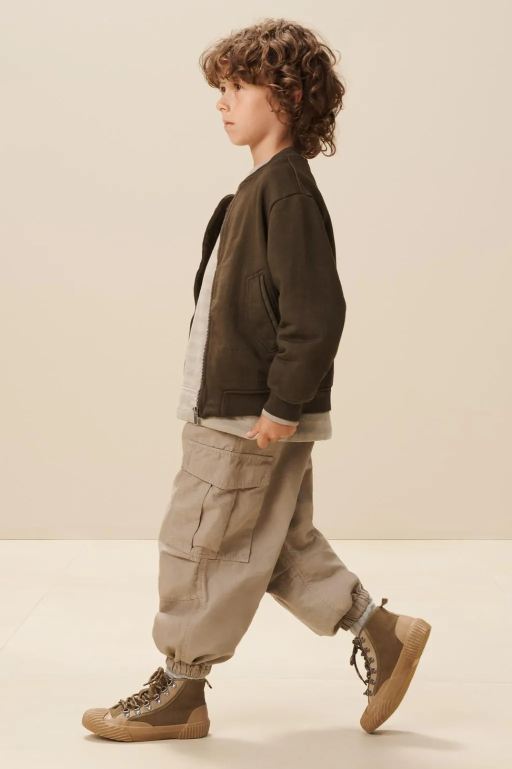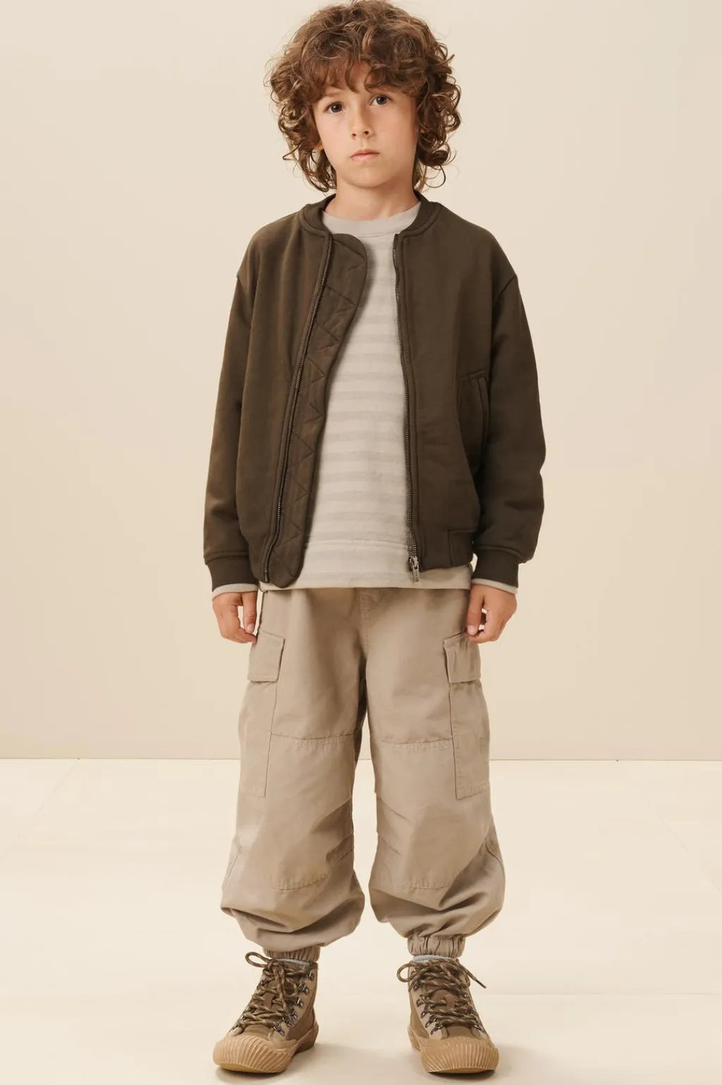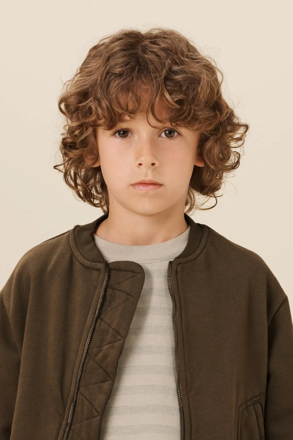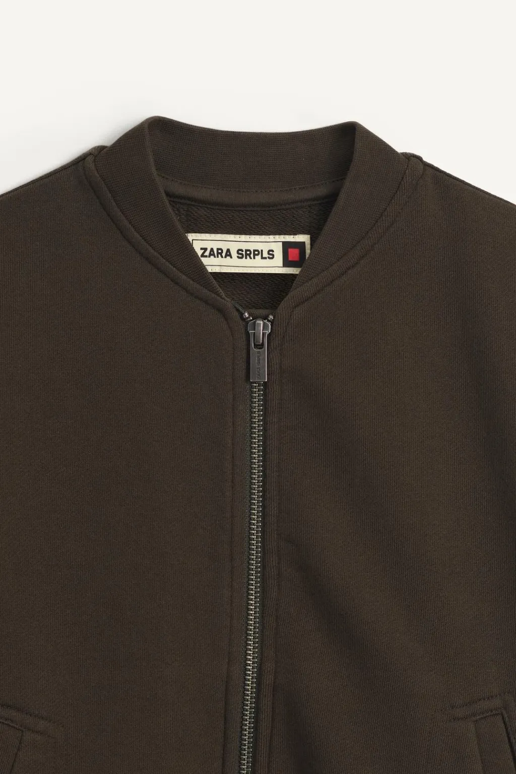 Bomber de felpa con cuello redondo y manga larga acabada en puño. Cierre de cremallera frontal. Bolsillos delanteros con detalle pespuntes. Bajo acabado en goma. Detalle texto bordado combinado a tono y etiqueta en espalda.