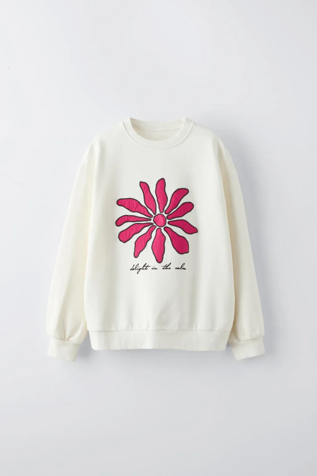 Sudadera con cuello redondo y manga larga. Detalle flor con bordado y estampado en delantero. Acabados en rib.
