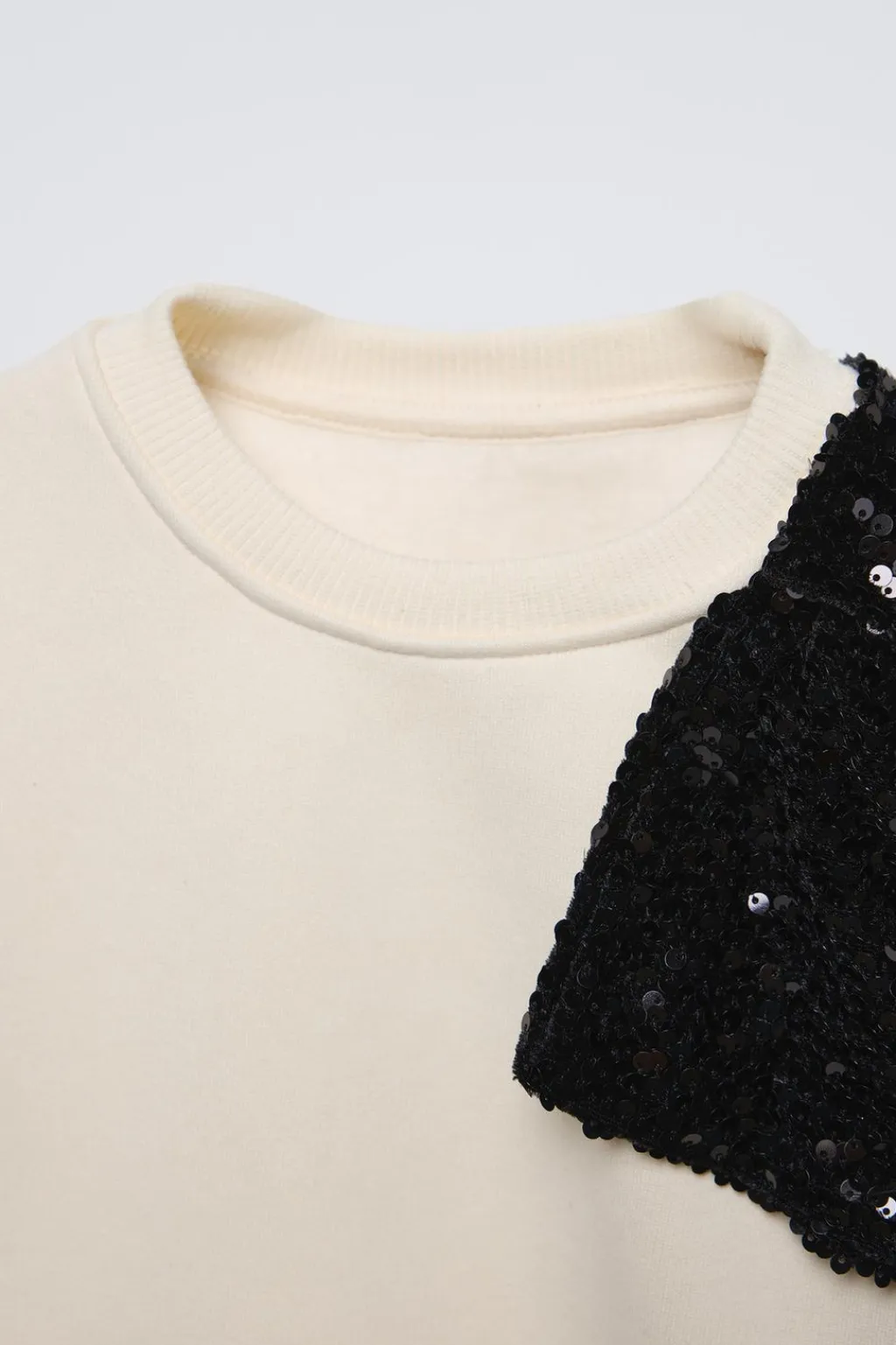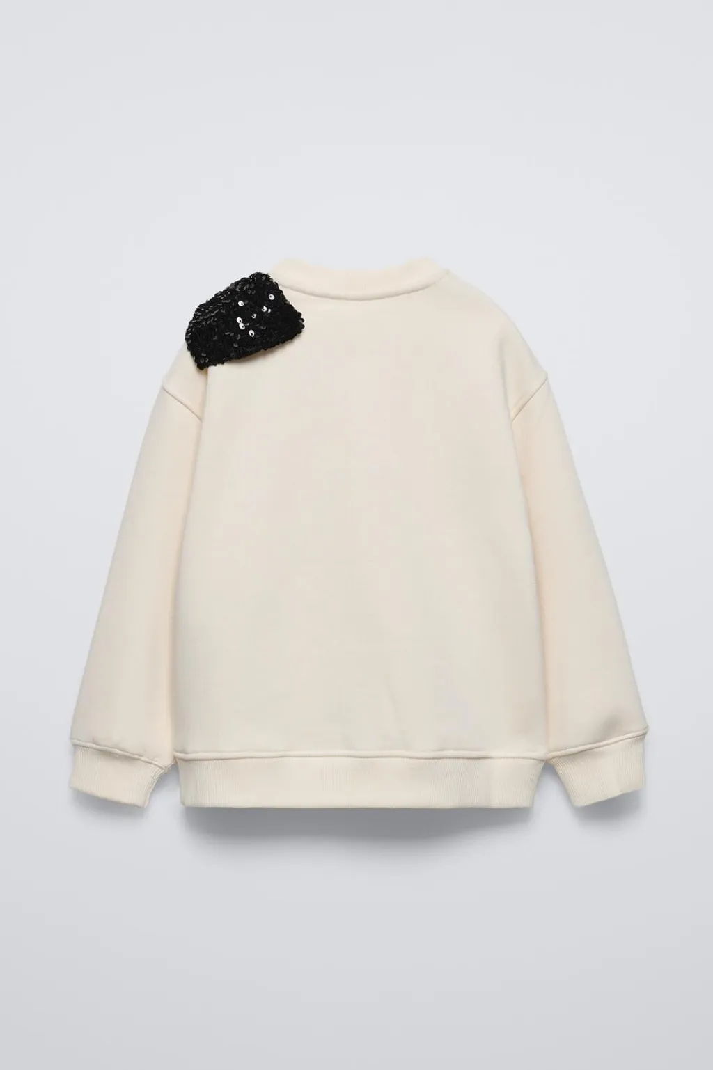 Sudadera con cuello redondo y manga larga. Acabados en rib. Aplique lazo en hombro con detalle lentejuelas. Calidad interior cálida y suave.