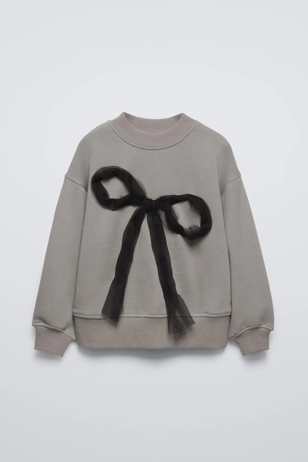 Sudadera con cuello redondo y manga larga. Acabados en rib. Aplique lazo de tul en delantero. Calidad interior cálida y suave.