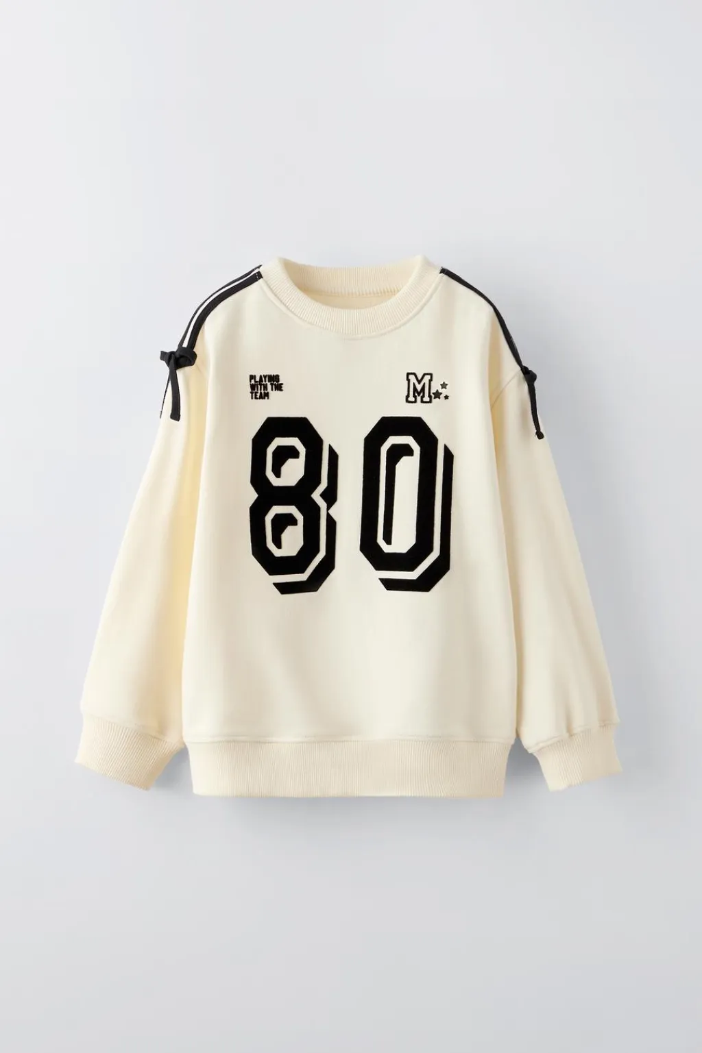 Sudadera con cuello redondo y manga larga. Acabados en rib. Detalle texto con flock en delantero y bandas con aplique lazos en hombros.