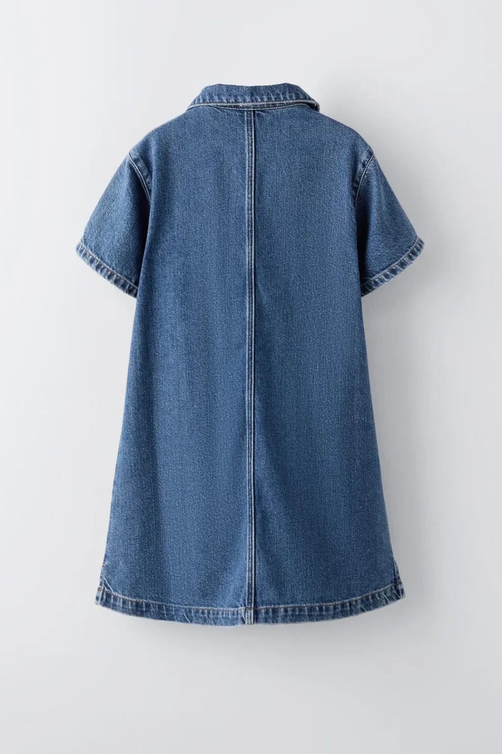 Vestido denim con cuello camisero y manga corta. Cierre frontal con botones tipo presión. Bolsillo en delantero