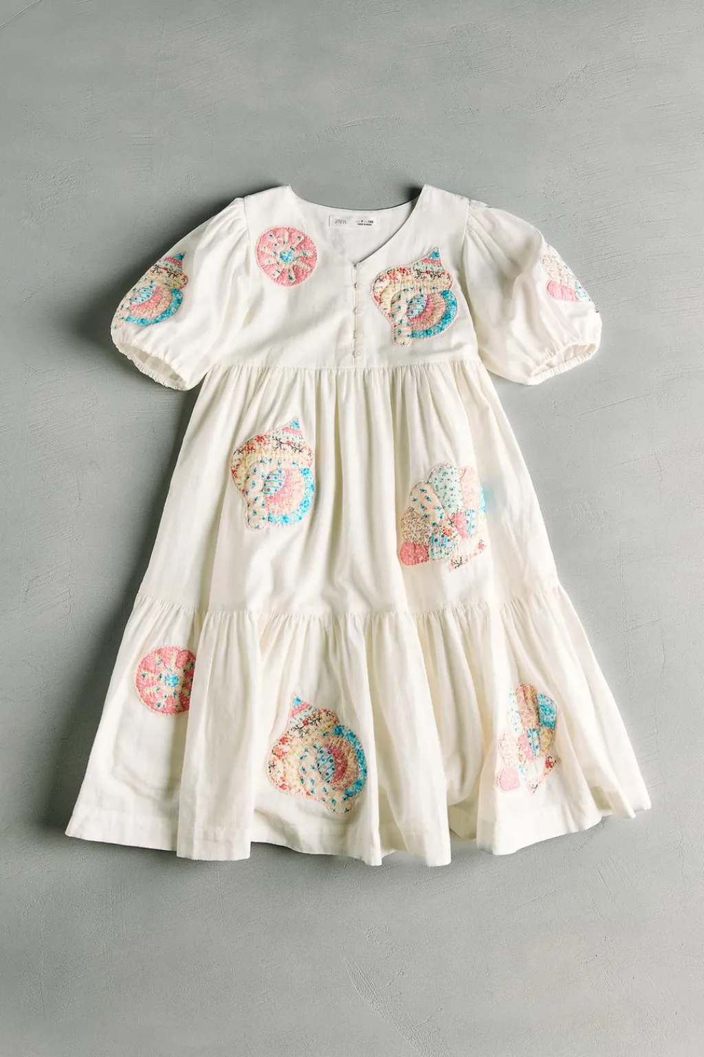 Cuello pico con botones en canesú y manga corta abullonada acabada en goma. Detalle parches tipo patchwork bordados con motivos marinos y estampados florales.