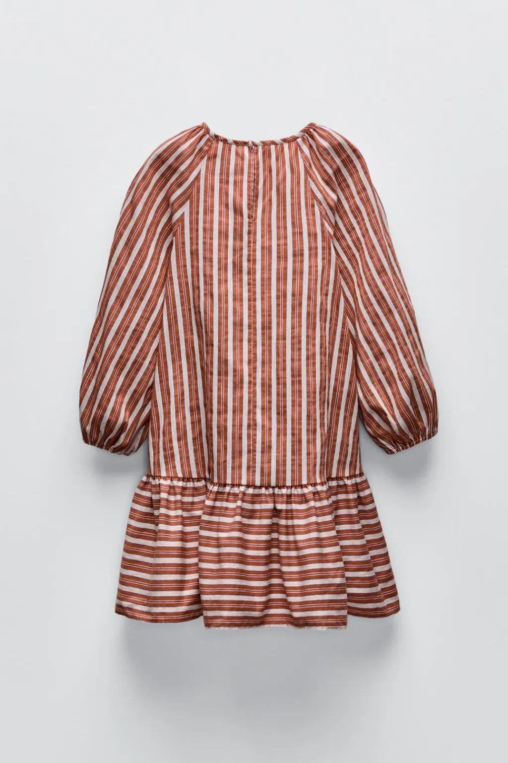 Vestido con cuello redondo y manga larga acabada en goma. Cierre tipo lágrima con botón en espalda. Bajo acabado en volante.