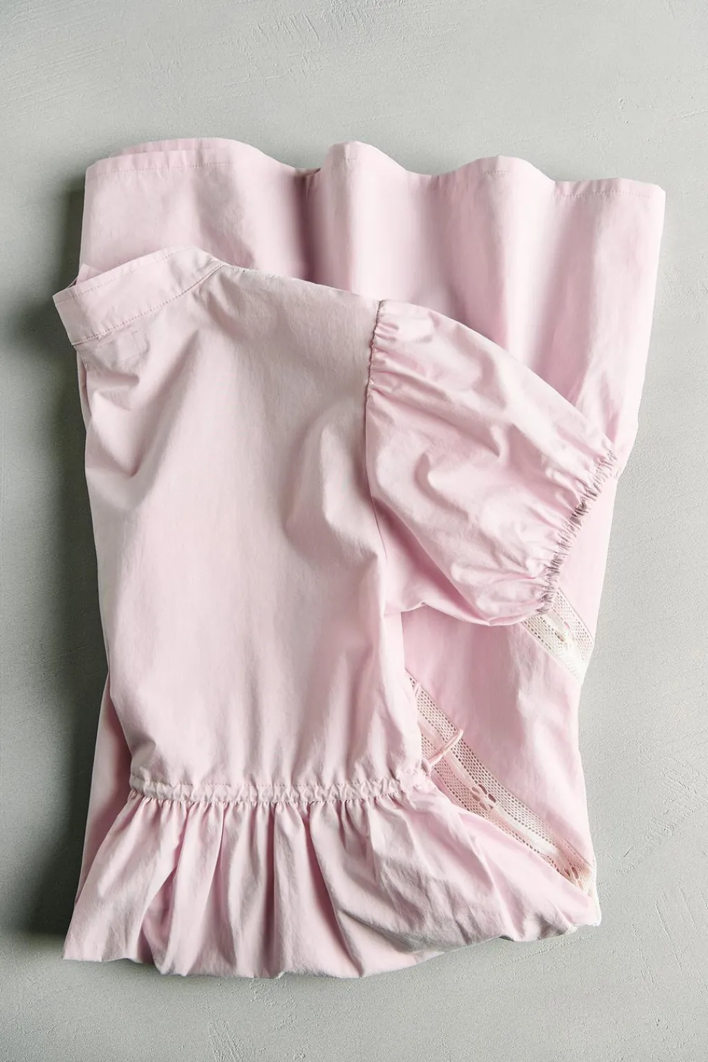 Cuello subido y cierre en canesú con botones tipo snap. Manga corta abullonada con acabado elástico. Bolsillo tipo canguro con tapeta, cierre botones y SEA NEW YORK bordado en delantero. Goma ajustable con stoppers laterales en cintura. Detalle encaje entredós por toda la prenda. Bajo acabado con volante.