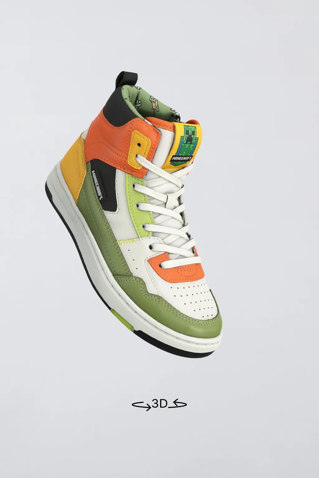 Zapatilla tipo botín deportivo multicolor MINECRAFT © MOJANG AB. ™. Cierre mediante cordones ajustables y cremallera lateral. Tirador trasero para facilitar el calce. Plantilla flexible. Suela de goma en contraste de color.