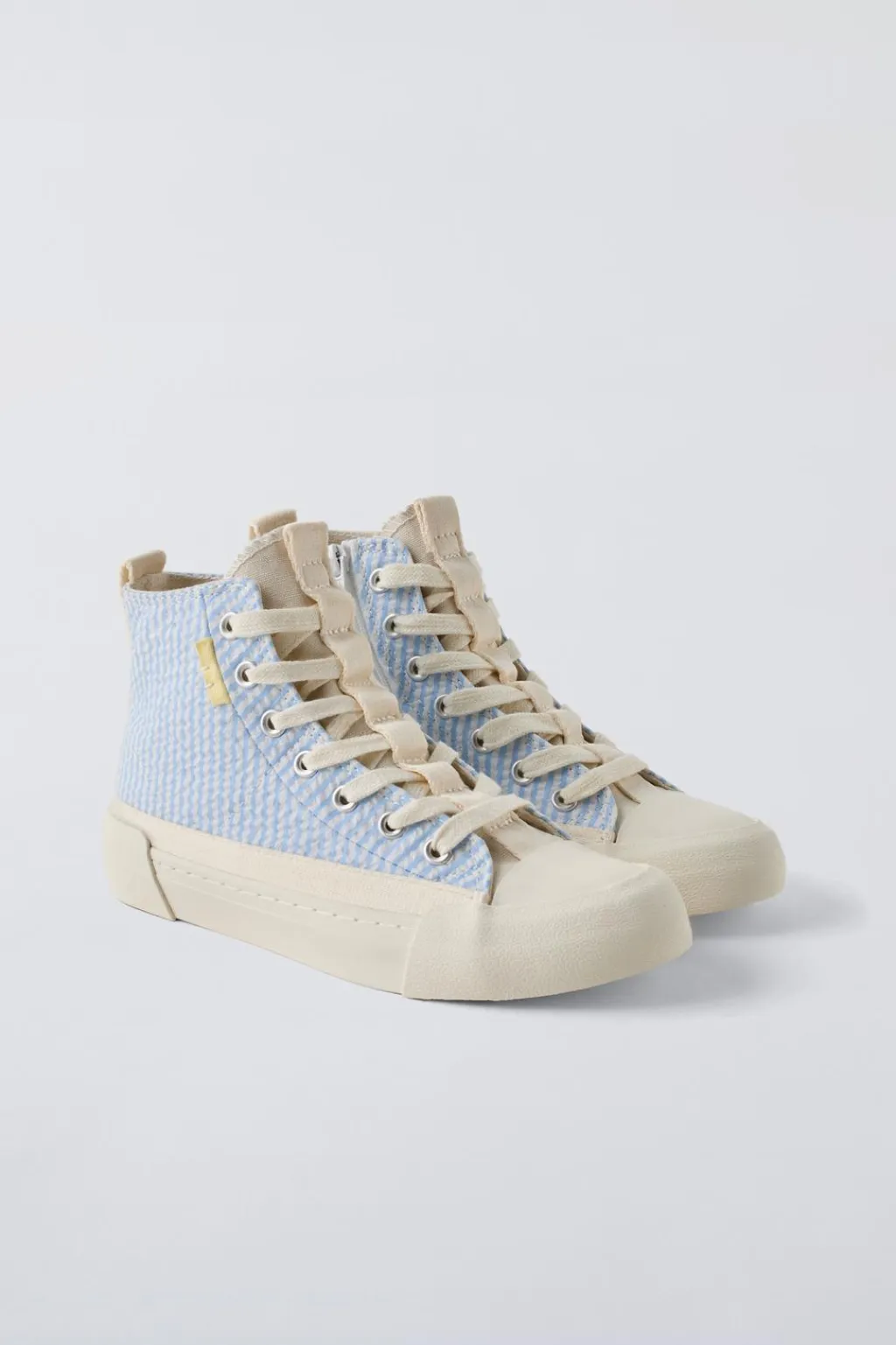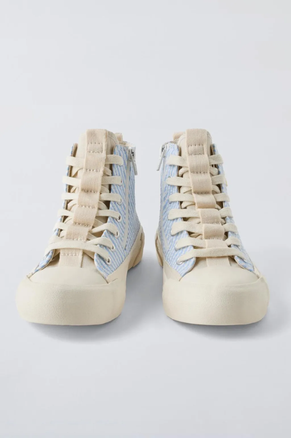 Zapatilla tipo botín deportivo estampado a rayas. Cierre mediante cremallera lateral y cordones ajustables. Plantilla flexible y forro interior 100% algodón. Tirador trasero para facilitar el calce. Puntera de goma reforzada. Suela en plataforma de goma.