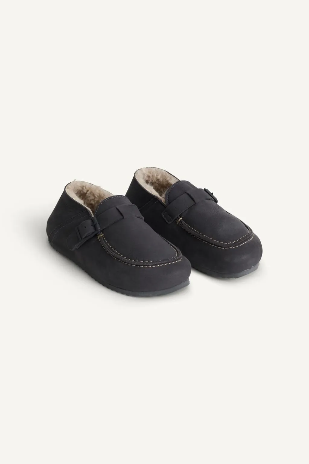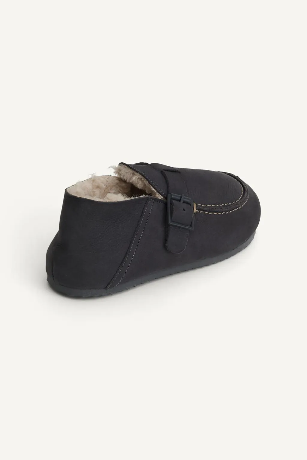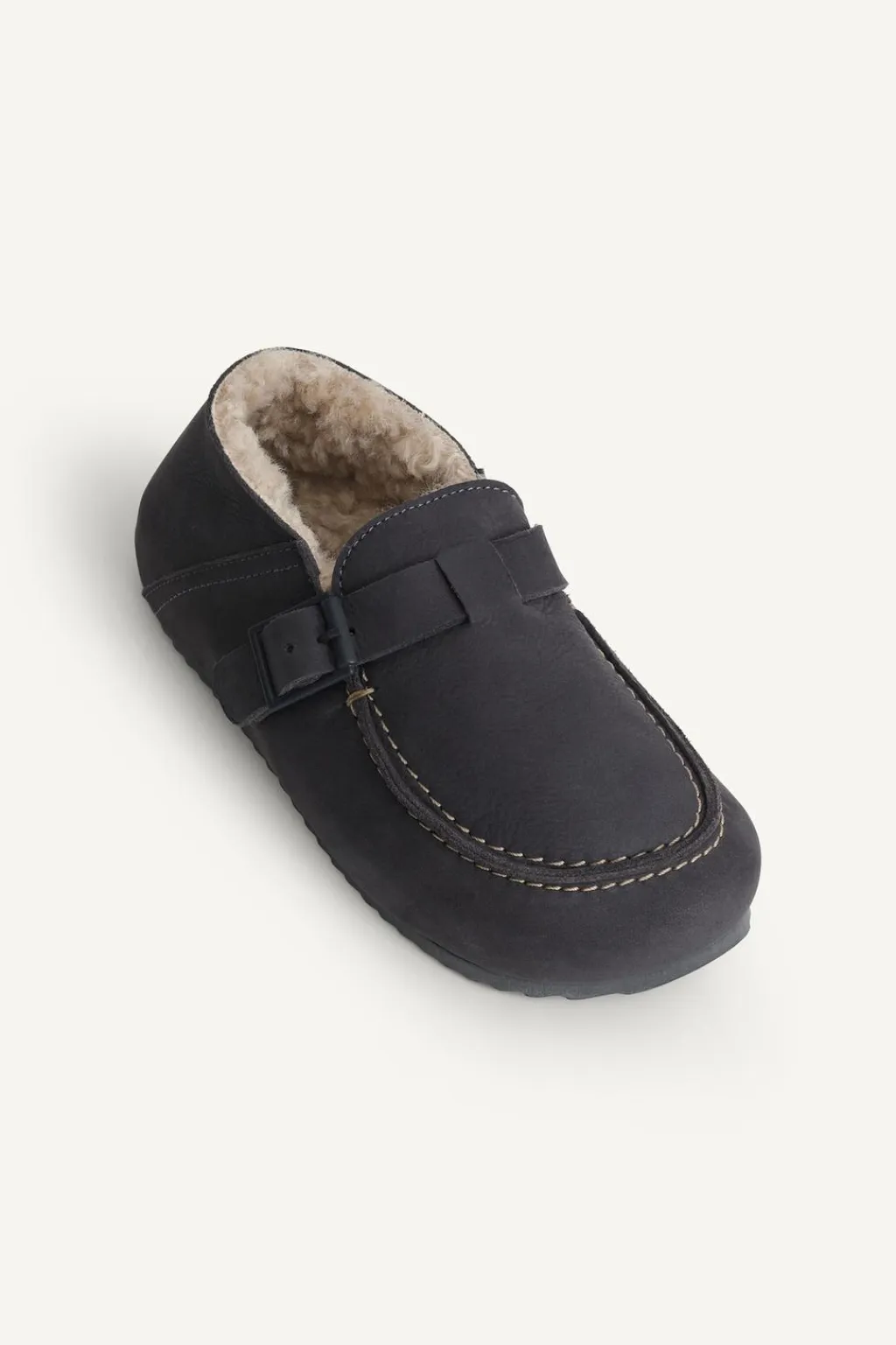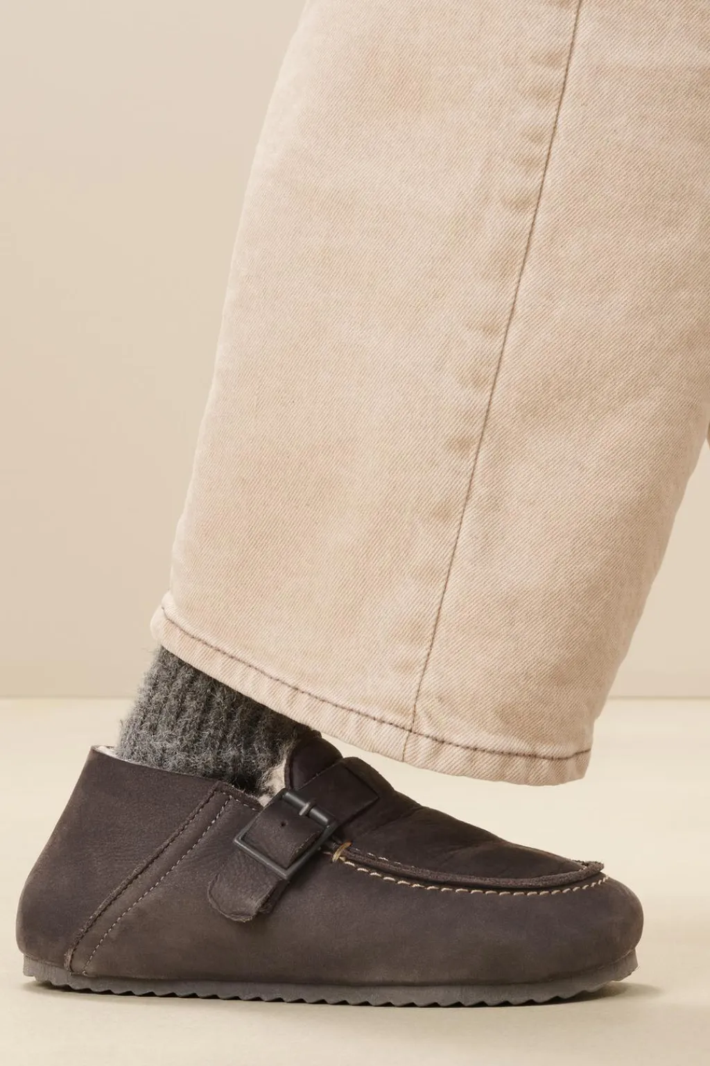 Zapato 100% piel vacuno con detalle ribeteado en el frontal con opción a llevar de forma destalonada. Forro interior de borreguillo. Cierre mediante hebilla lateral. Suela de goma dentada.