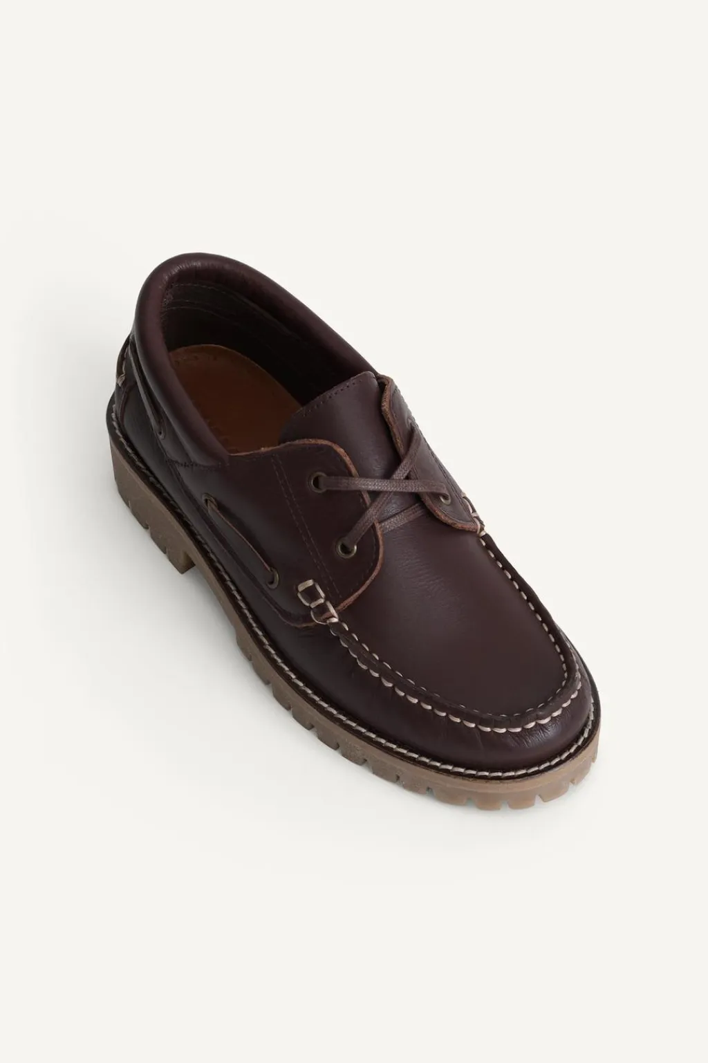 Zapato tipo mocasín náutico 100% piel vacuno. Cierre mediante cordones ajustables. Detalle de continuación del cordón en el lateral del corte. Plantilla flexible 100% piel ovina. Forro interior 100% piel vacuno. Suela de goma dentada.