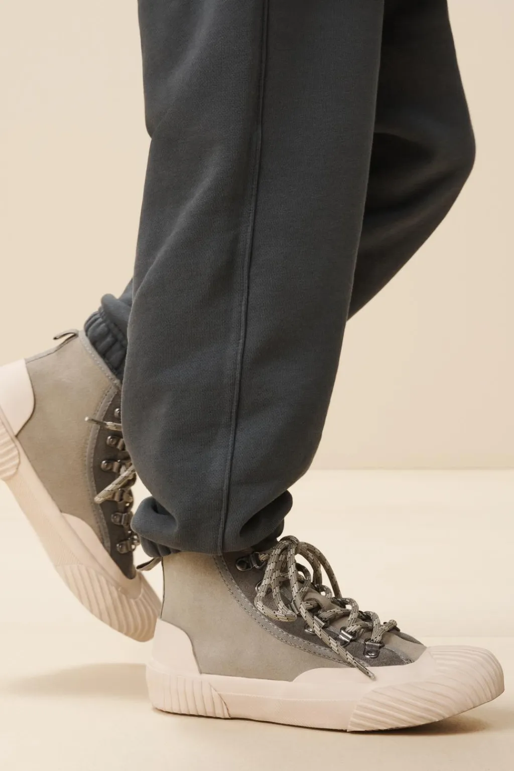Zapatilla tipo botín deportivo piel vacuno. Cierre mediante cordones ajustables. tirador trasero para facilitar el calce. Plantilla flexible. Puntera de goma reforzada. Suela de goma en contraste de color.
