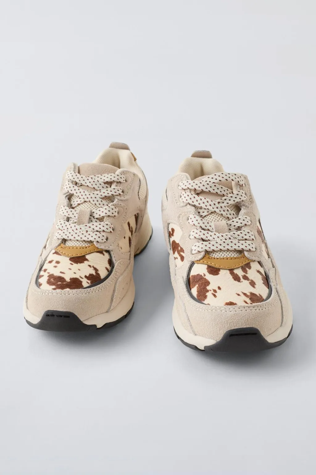 Zapatilla deportiva con estampado cow en combinación de pelo de vaca y piel vacuno. Cierre mediante cordones ajustables. Plantilla flexible. Suela de goma.