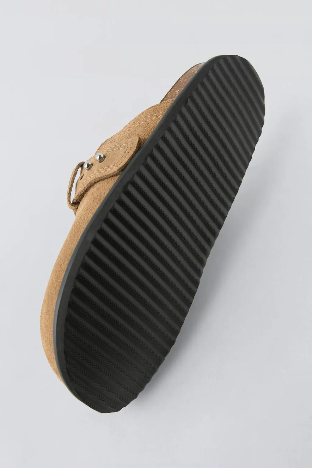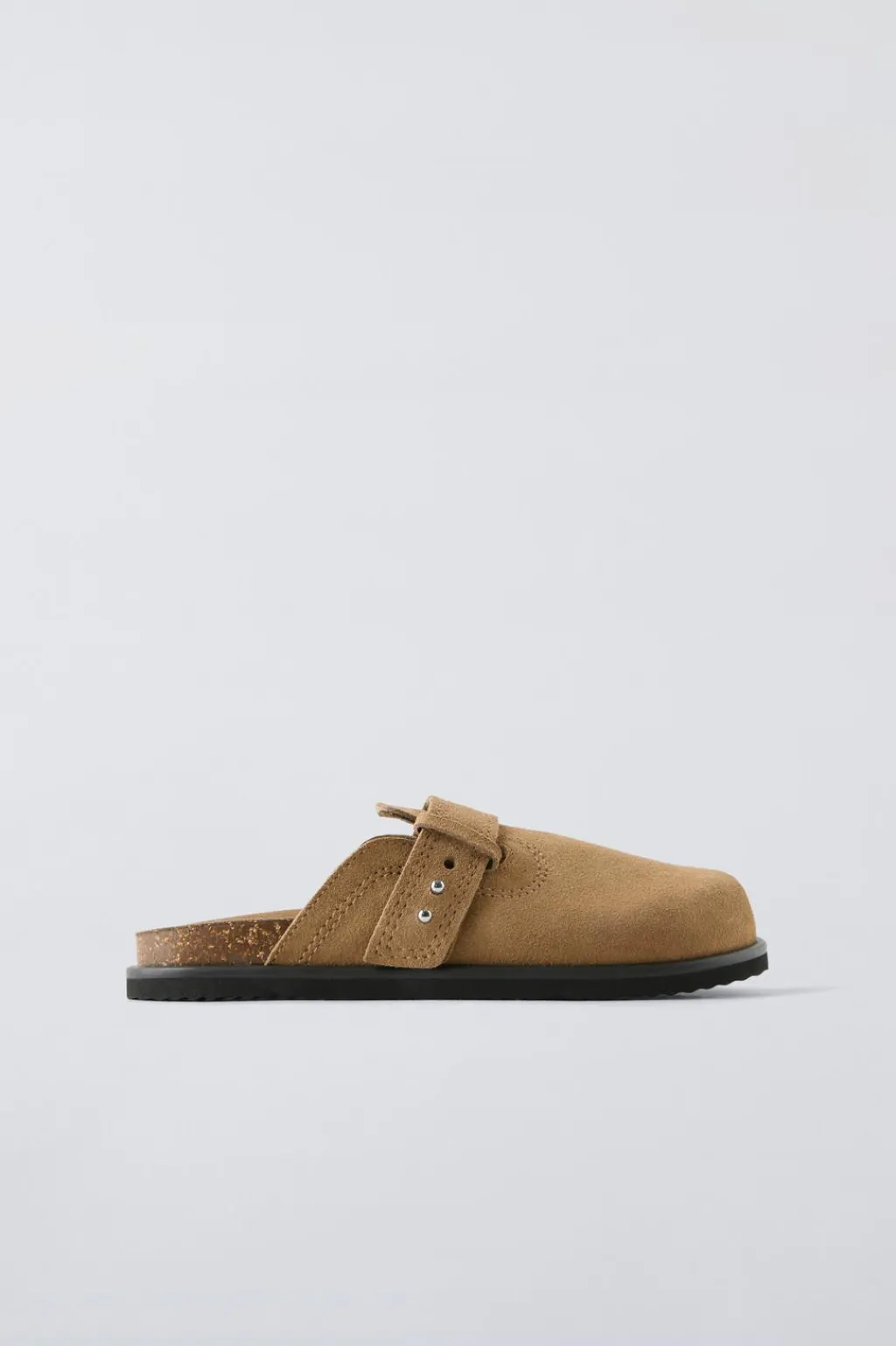 Zueco 100% piel vacuno acabado en serraje. Suela de goma en contraste de color.