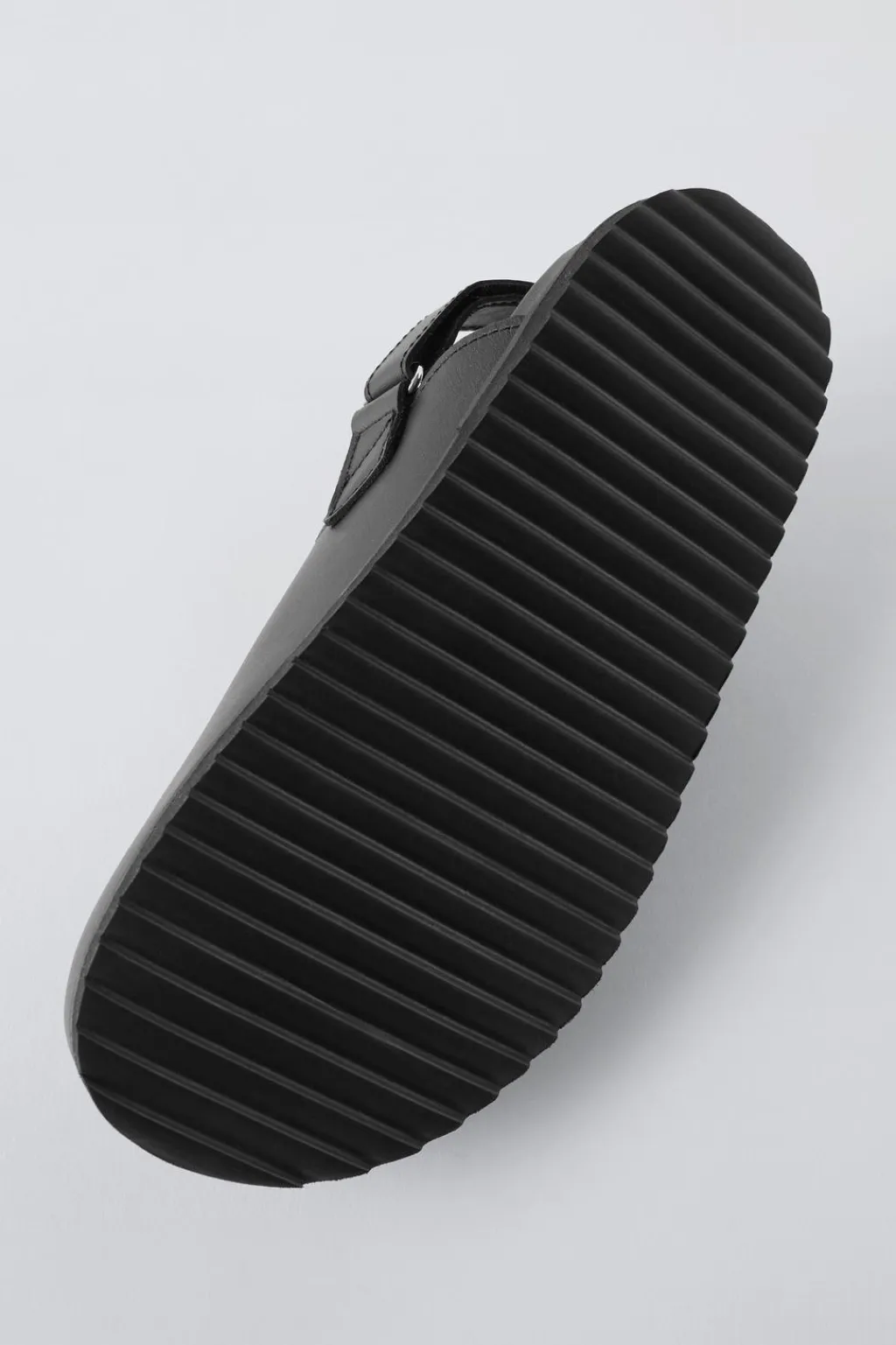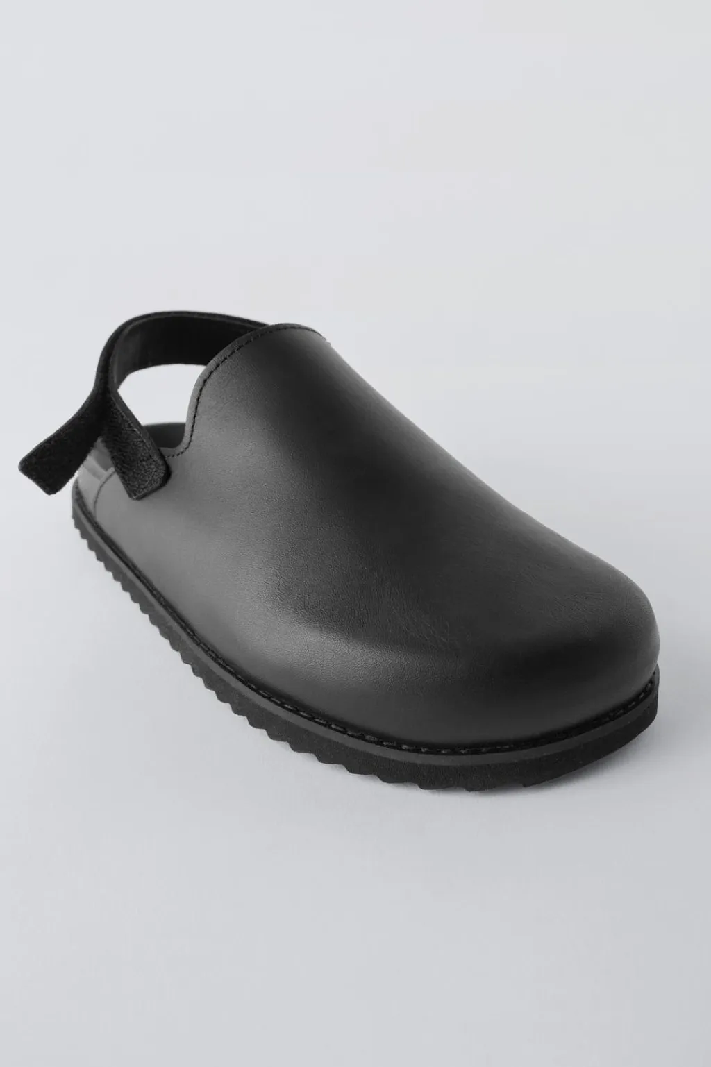 Zapato tipo zueco 100% piel vacuno. Cierre mediante tira adherente trasera. Plantilla 100% piel caprina. Suela de goma.