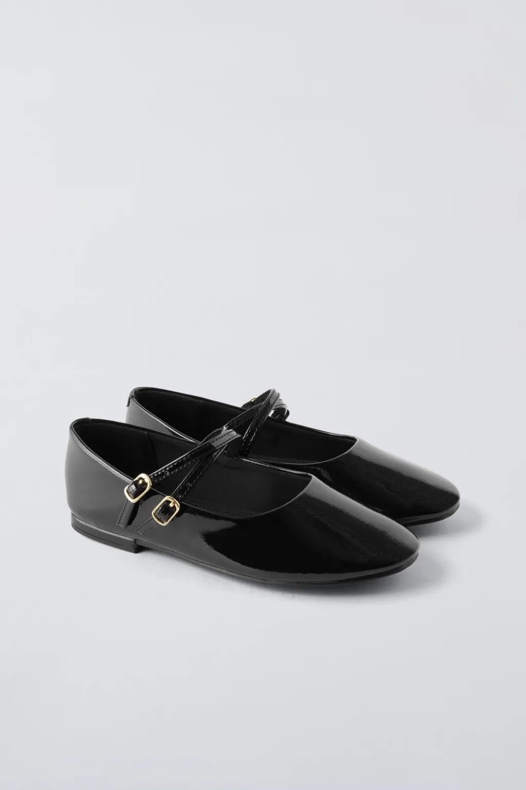 Zapato tipo bailarina acharolada. Doble tira con cierre mediante hebilla. Plantilla flexible. Suela de goma.