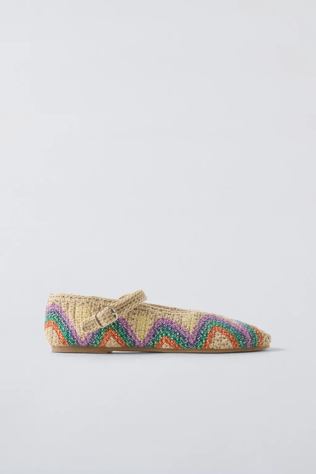 Zapato tipo bailarina crochet. Cierre mediante hebilla lateral. Plantillaflexible100% algodón. Suela de goma.