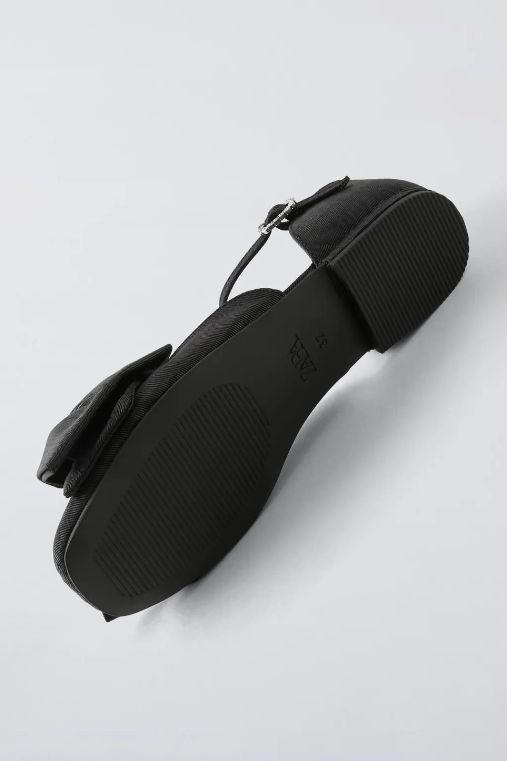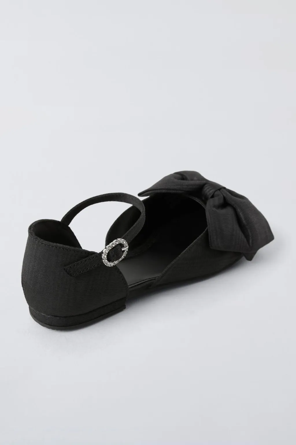 Zapato tipo bailarina con detalle de maxi lazo en el empeine. Cierre mediante hebilla lateral con detalle de strass. Plantilla flexible. Suela de goma.