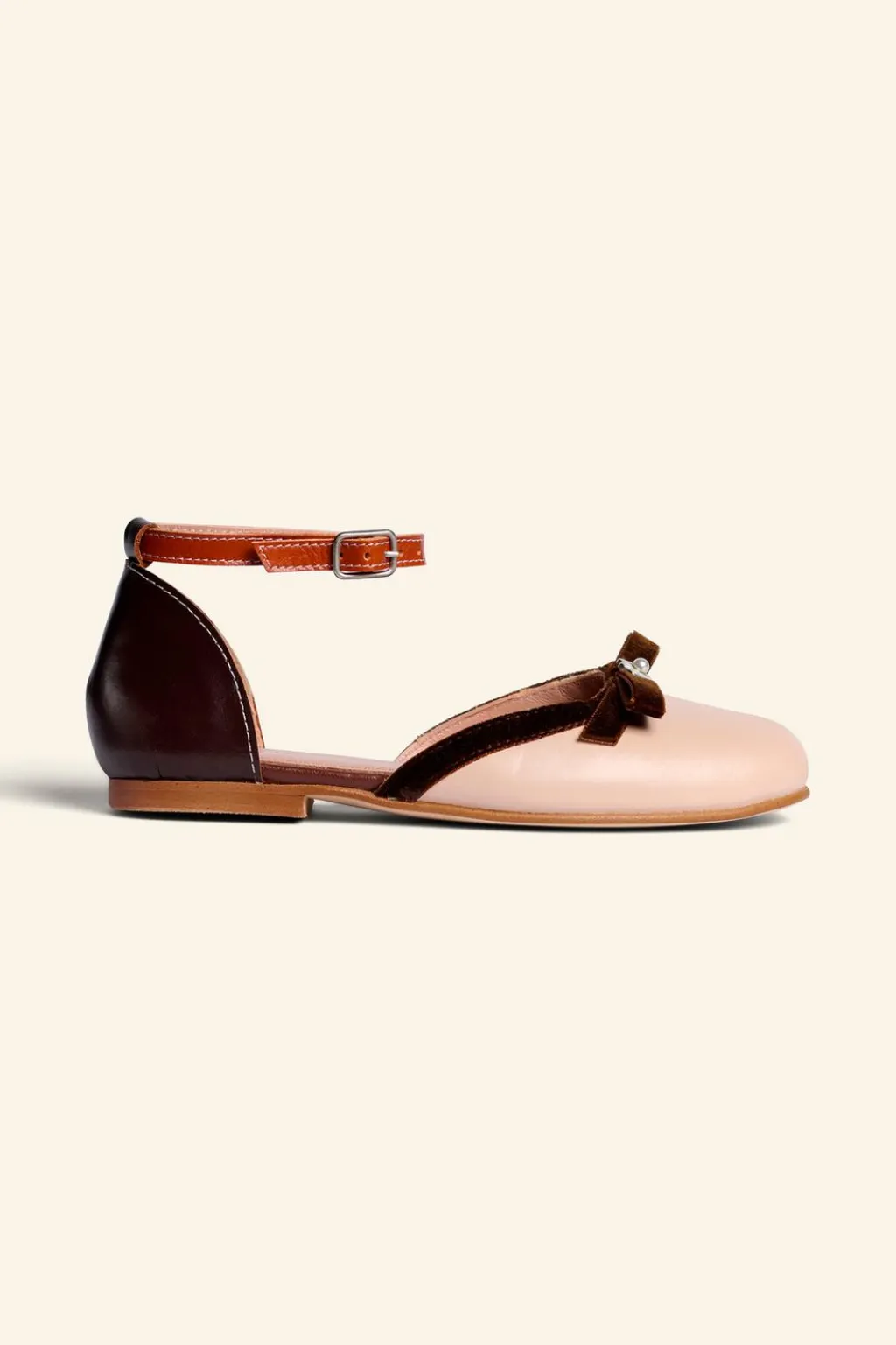 Zapato tipo bailarina 100% piel vacuno con detalle perla. Cierre mediante tira con hebilla en el tobillo. Plantilla flexible y forro 100% piel ovina. Suela de goma.