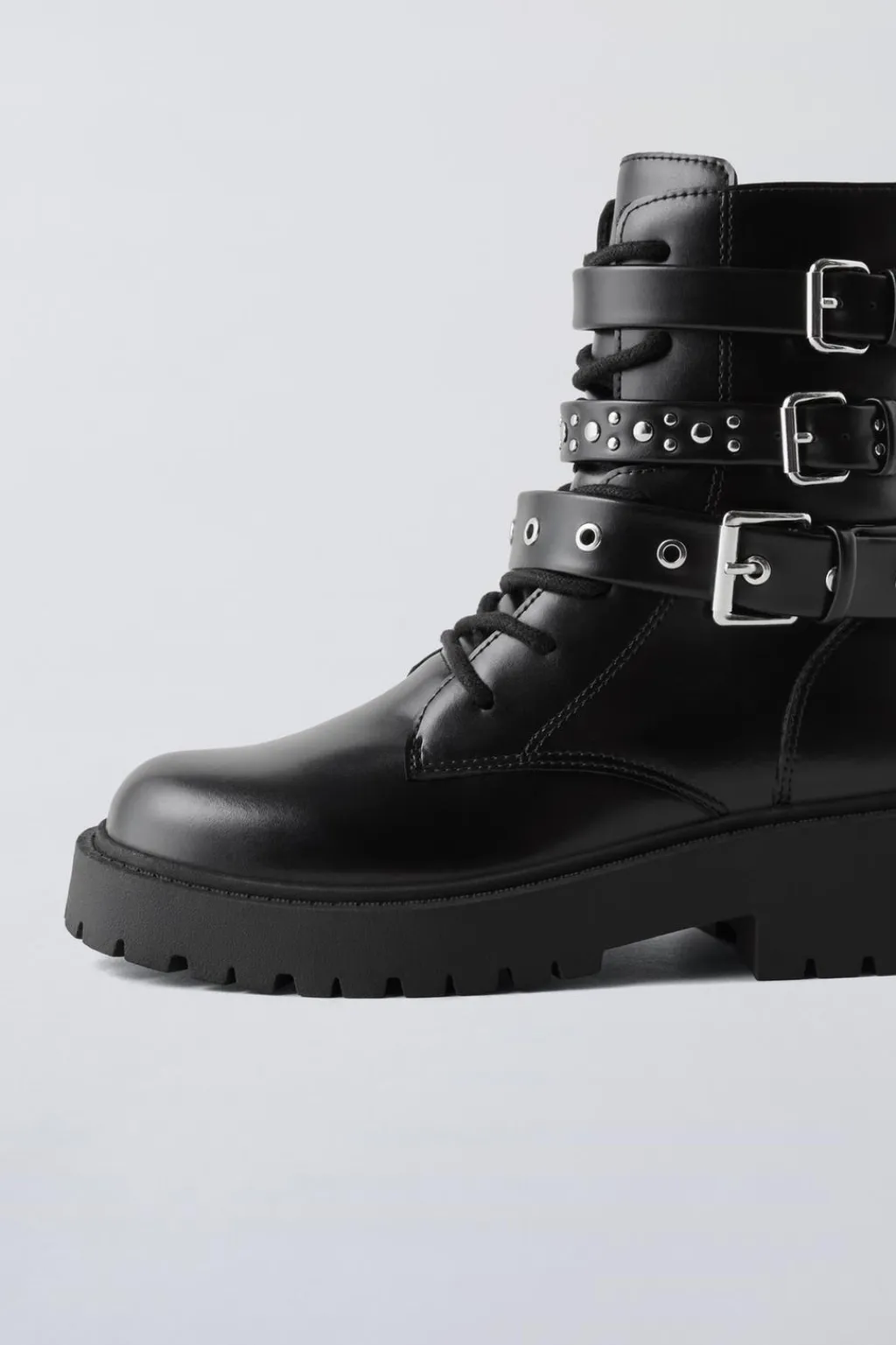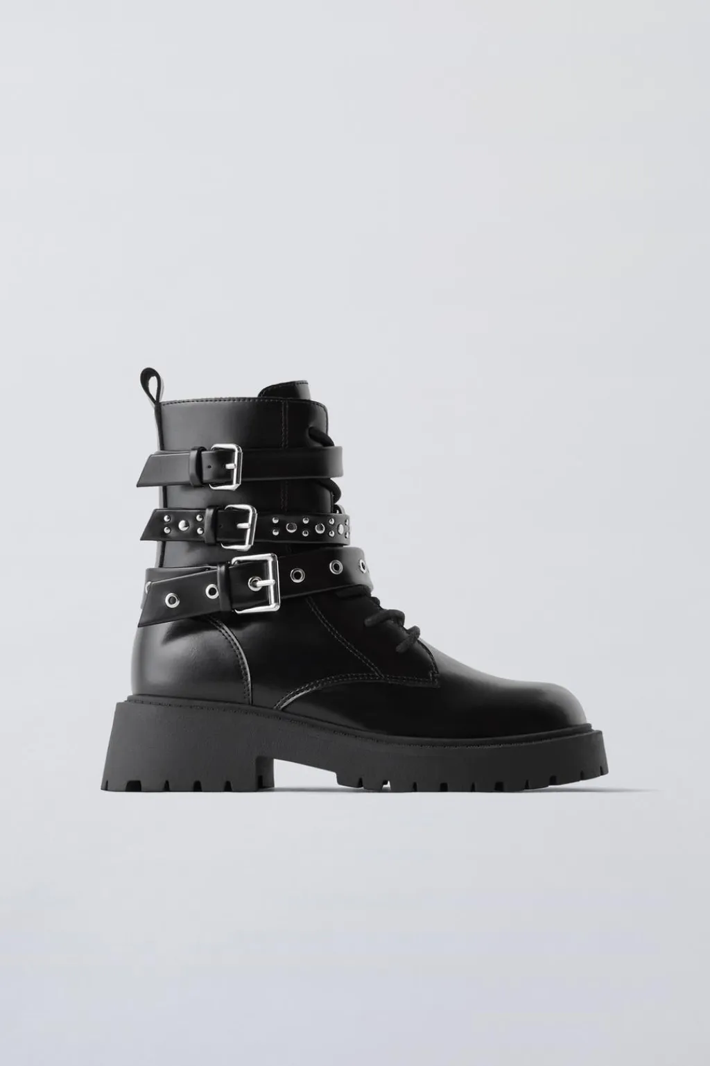 Botín detalle triple hebilla en el lateral. Cierre mediante cremallera lateral. Tirador trasero para facilitar el calce. Plantilla flexible. Suela de goma estilo track.