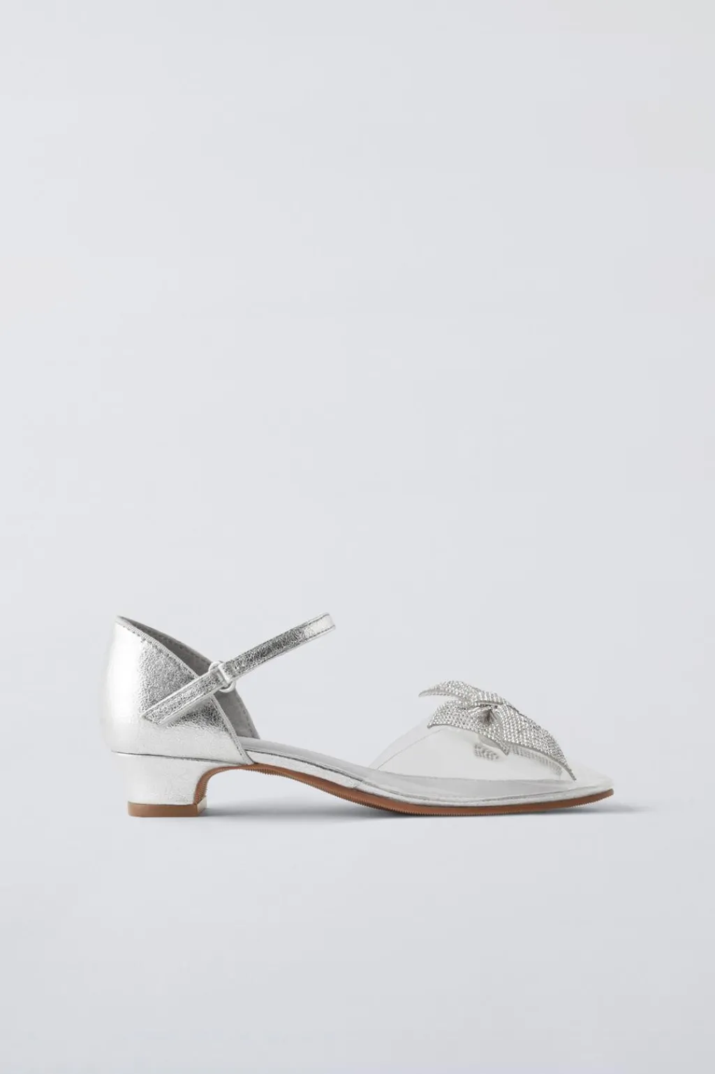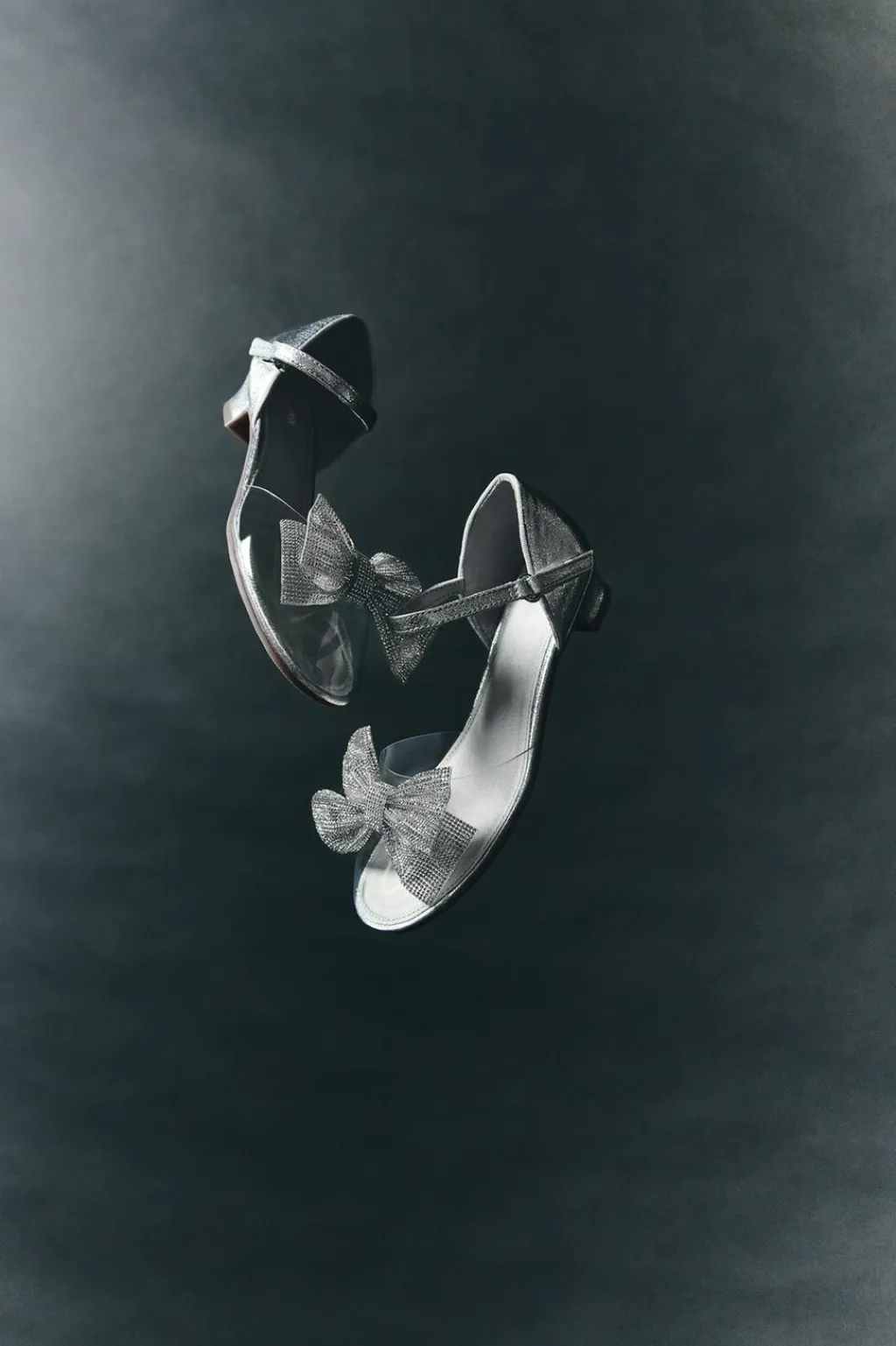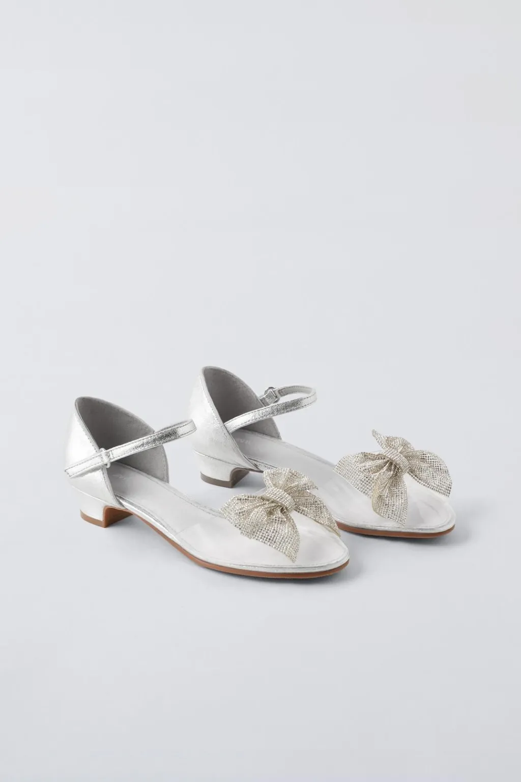 Zapato de tacón con detalle lazo brillos. Cierre mediante tira adhesiva en el tobillo. Suela de goma.