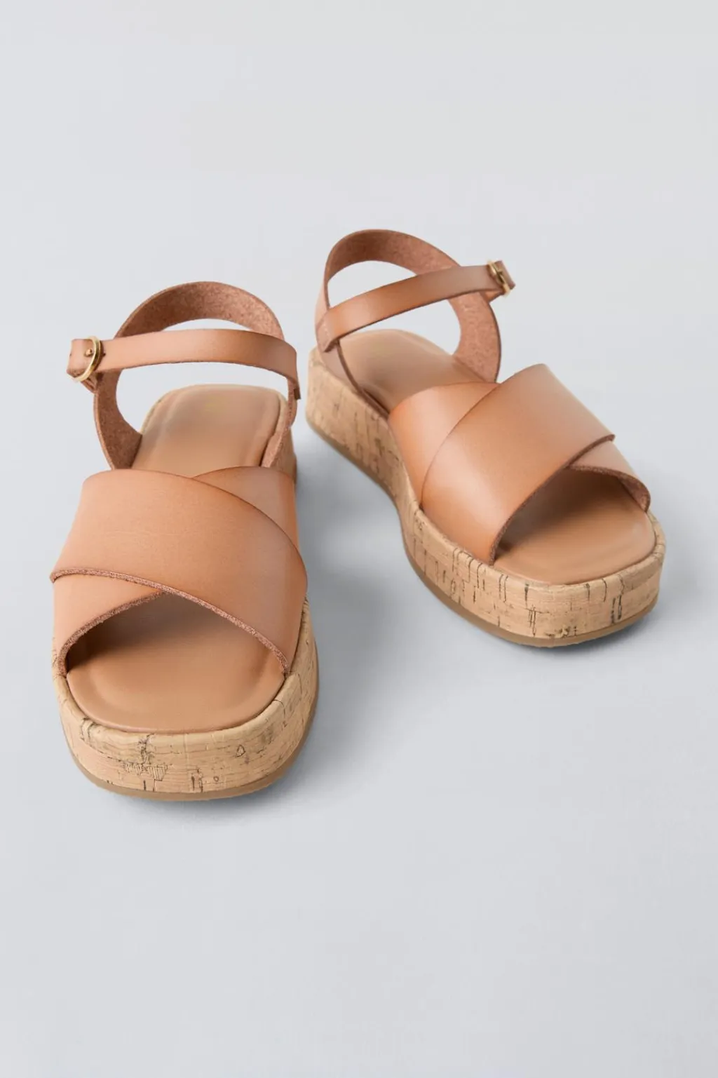 Sandalia cruzada. Cierre mediante hebilla lateral. Suela en plataforma de goma efecto corcho.