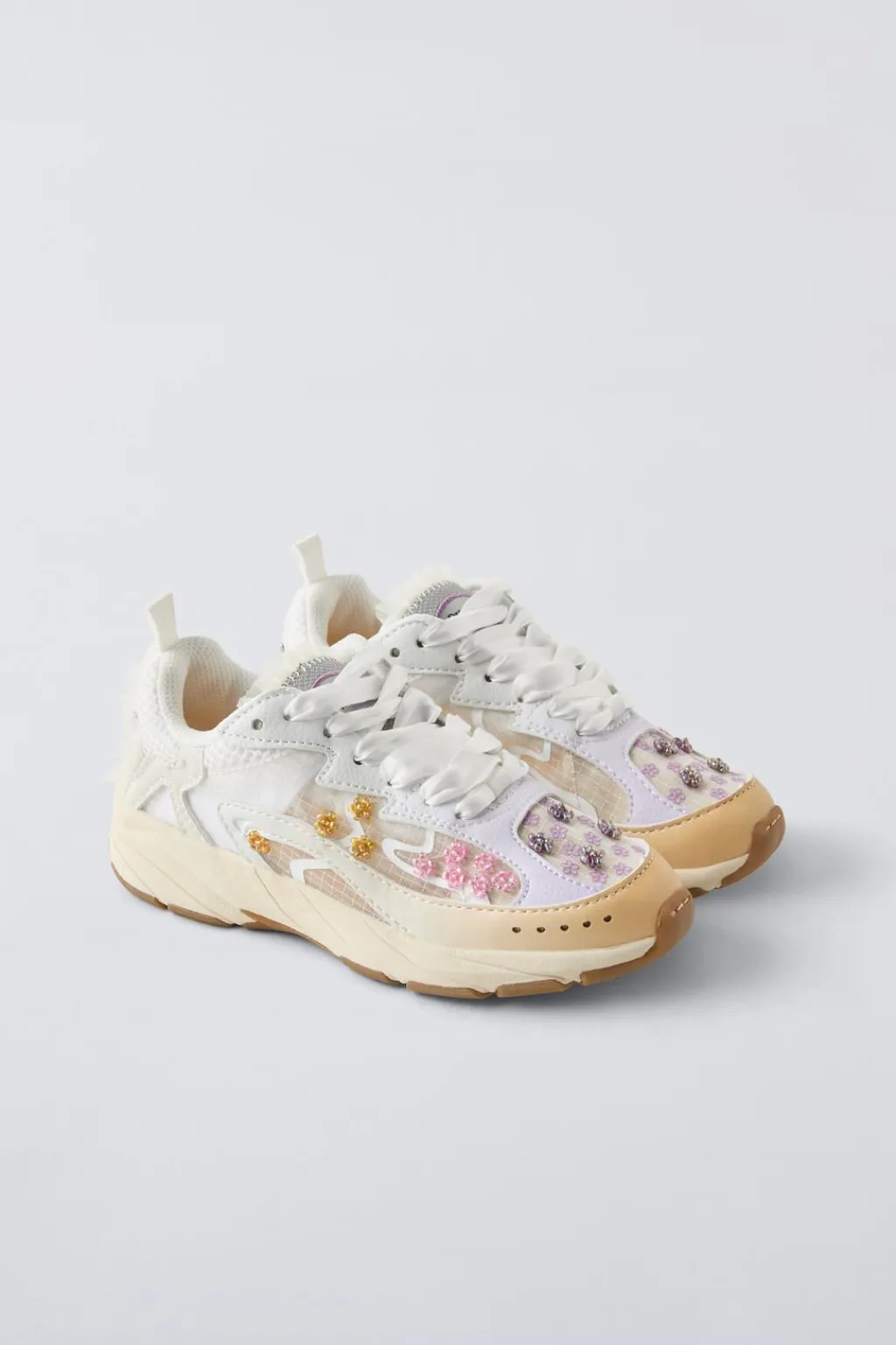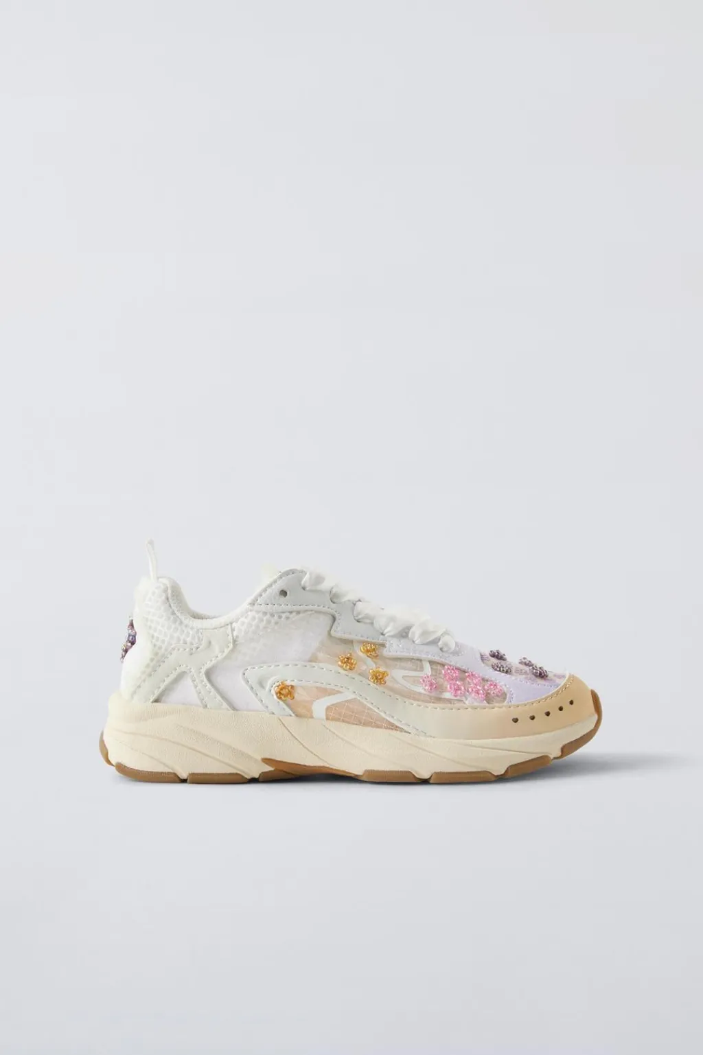 Zapatilla deportiva con detalle flores en abalorios y detalles en tul. En la lengüeta cuenta con detalles en tul. Cierre mediante lazo de raso ajustable. Plantilla flexible. Suela de goma.