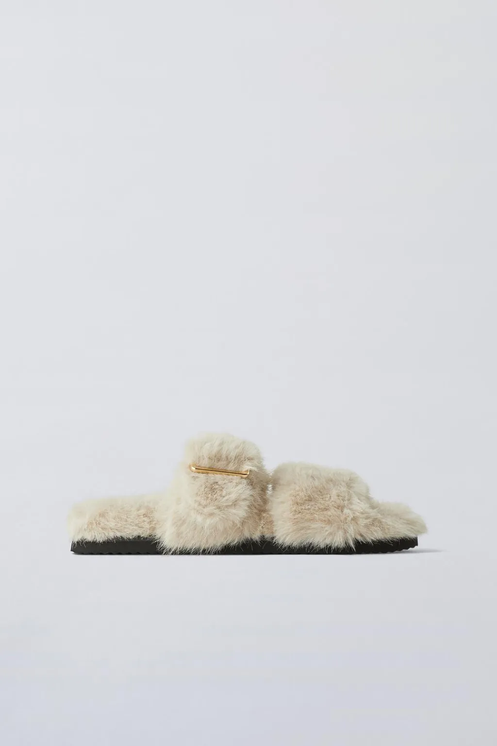 Zapatillas de casa efecto pelo. Doble tira en el empeine con hebilla para una mejor sujeción. Plantilla efecto pelo y suela de goma en contraste de color.
