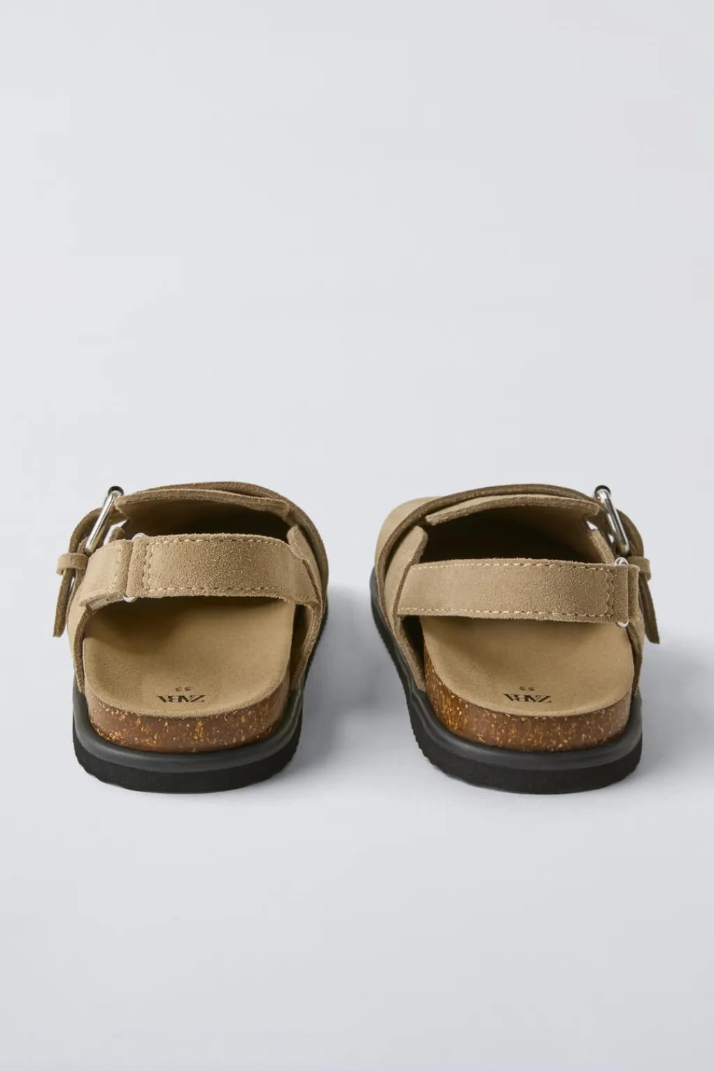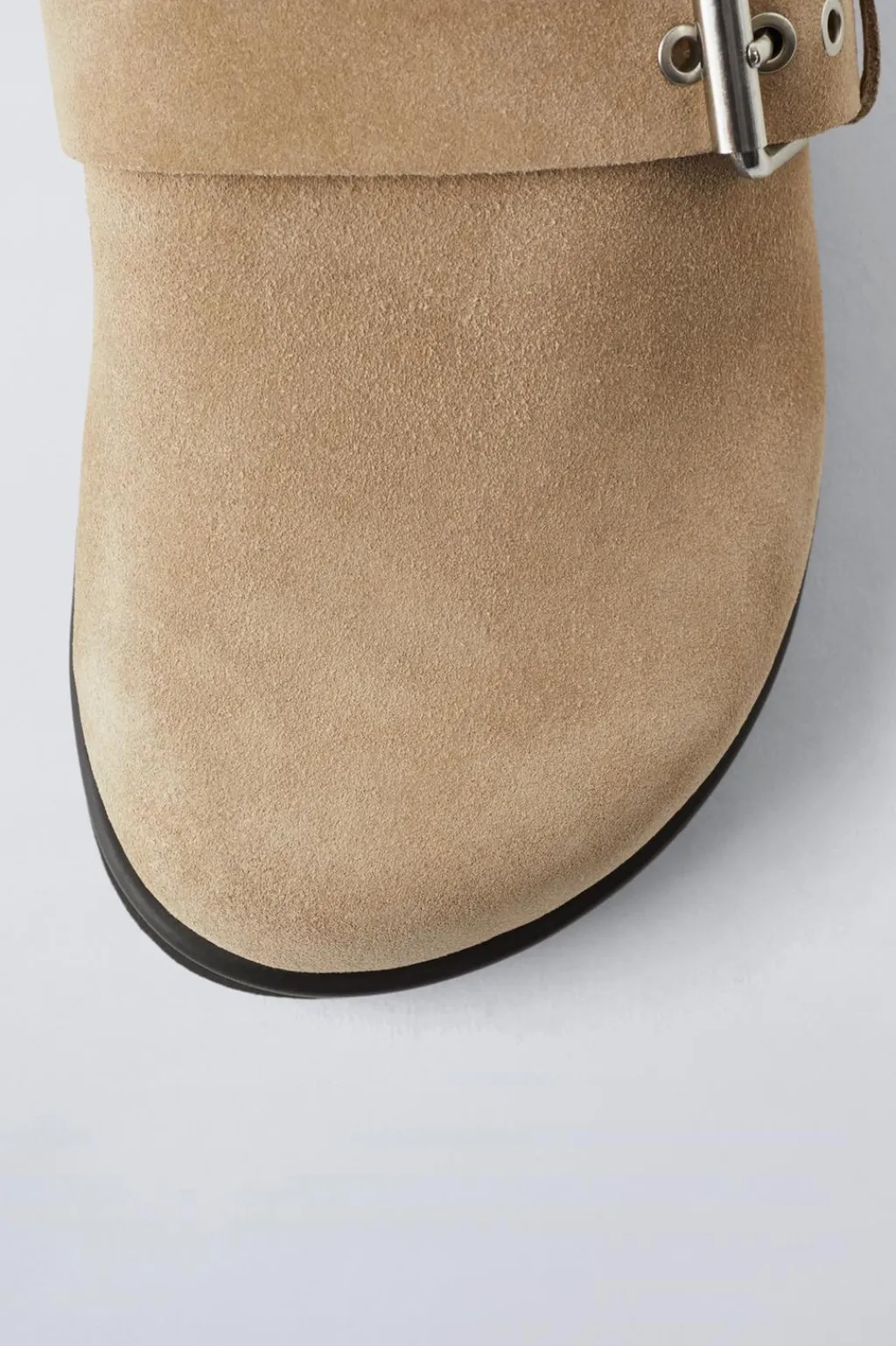 Zapato tipo zueco 100% piel vacuno acabado en serraje. Detalle hebilla en el lateral. Cierre mediante tira adherente trasera. Suela de goma.