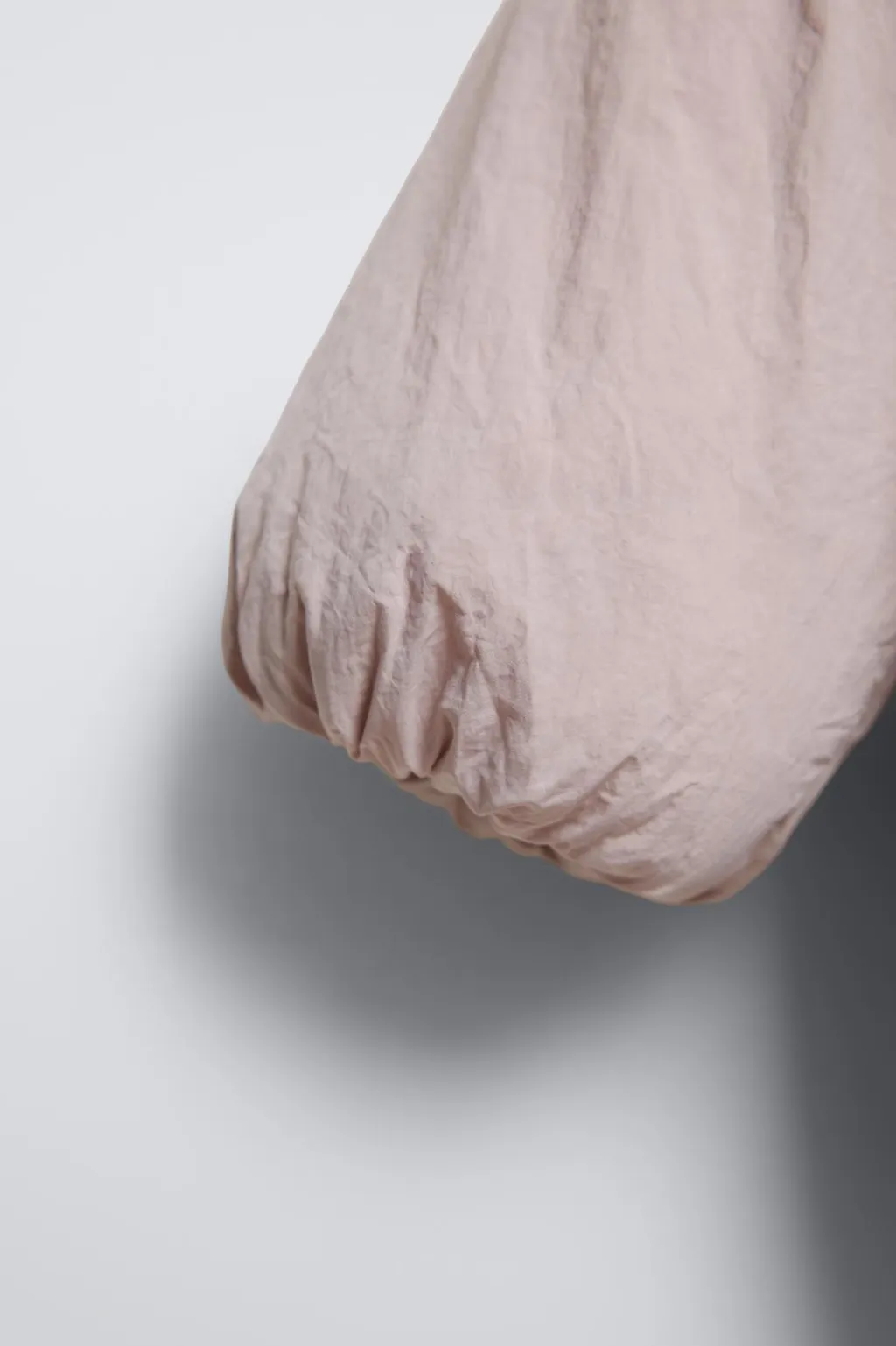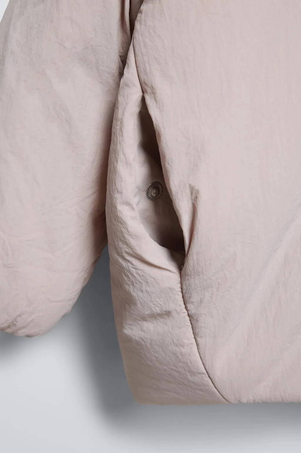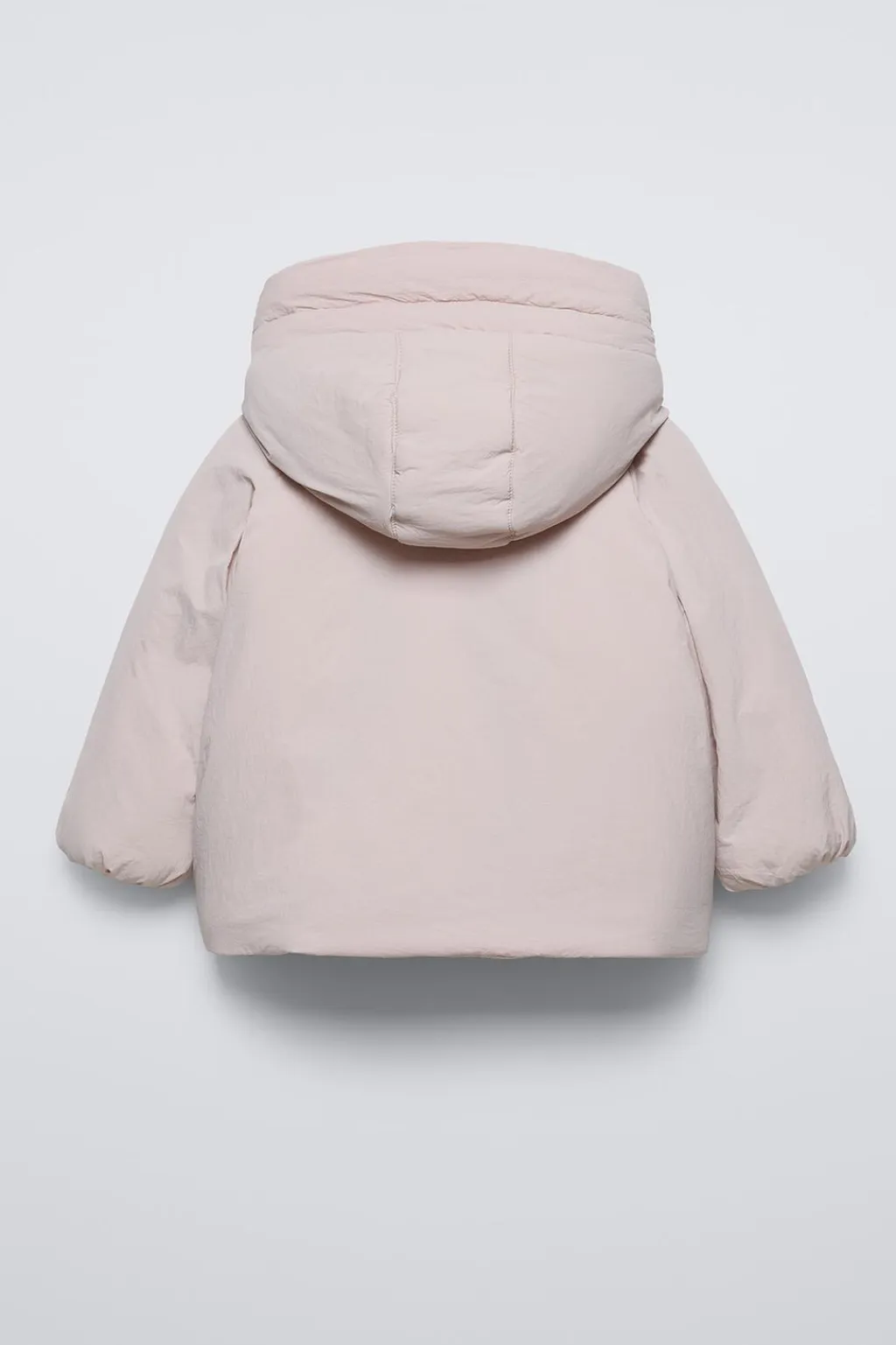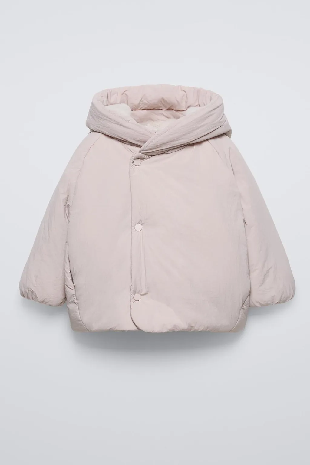 Abrigo con capucha y manga larga acabada en goma. Cierre con cremallera oculta y tapeta cruzada con botones tipo snap. Bolsillos en delantero. Interior forrado con tejido efecto pelo.