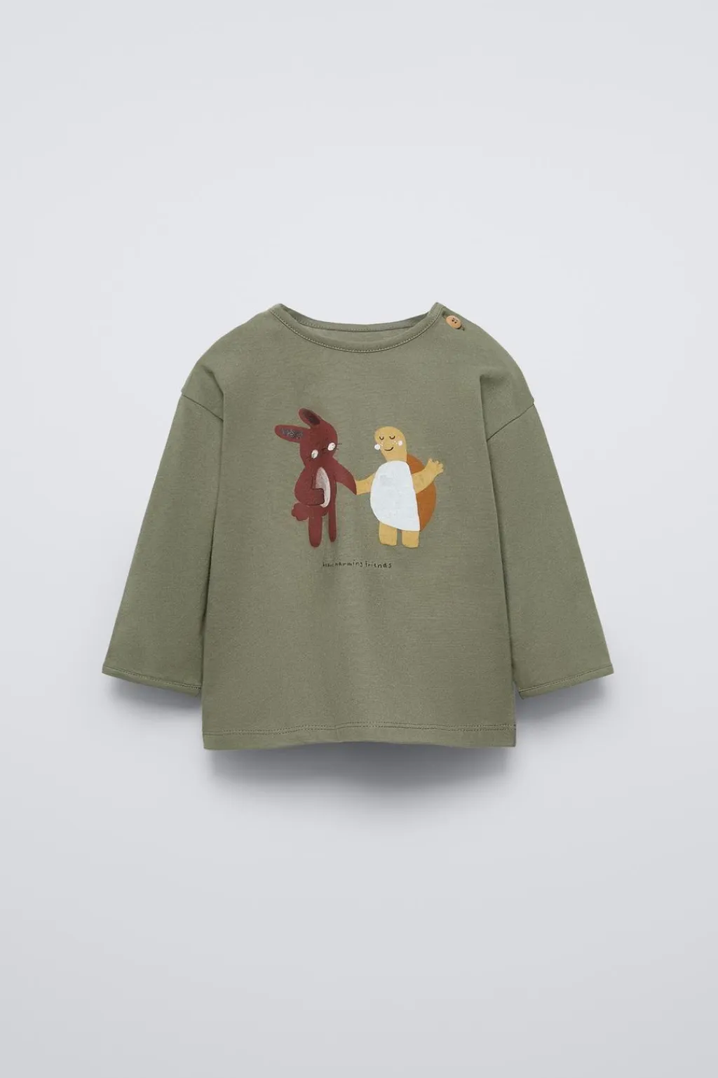 Camiseta con cuello redondo y manga larga. Estampado animales en delantero. Cierre con botón en hombro.