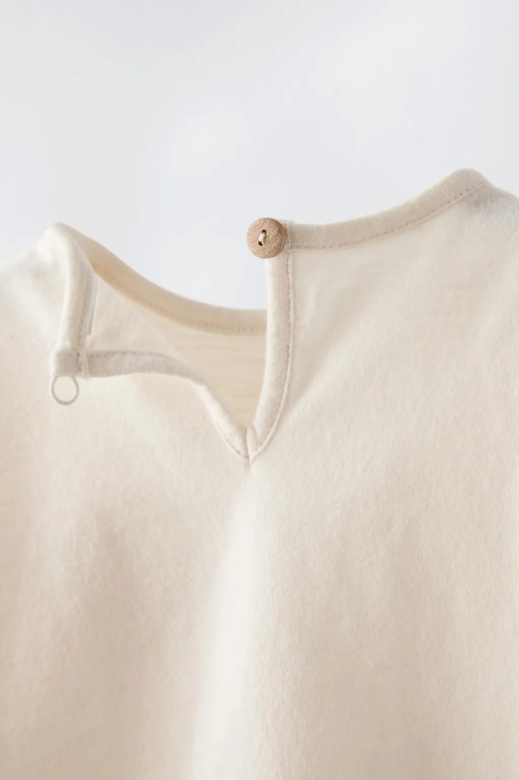 Camiseta con cuello redondo y manga larga. Cierre tipo lágrima con botón en espalda. Motivo bordado en pechera con detalle rizo.