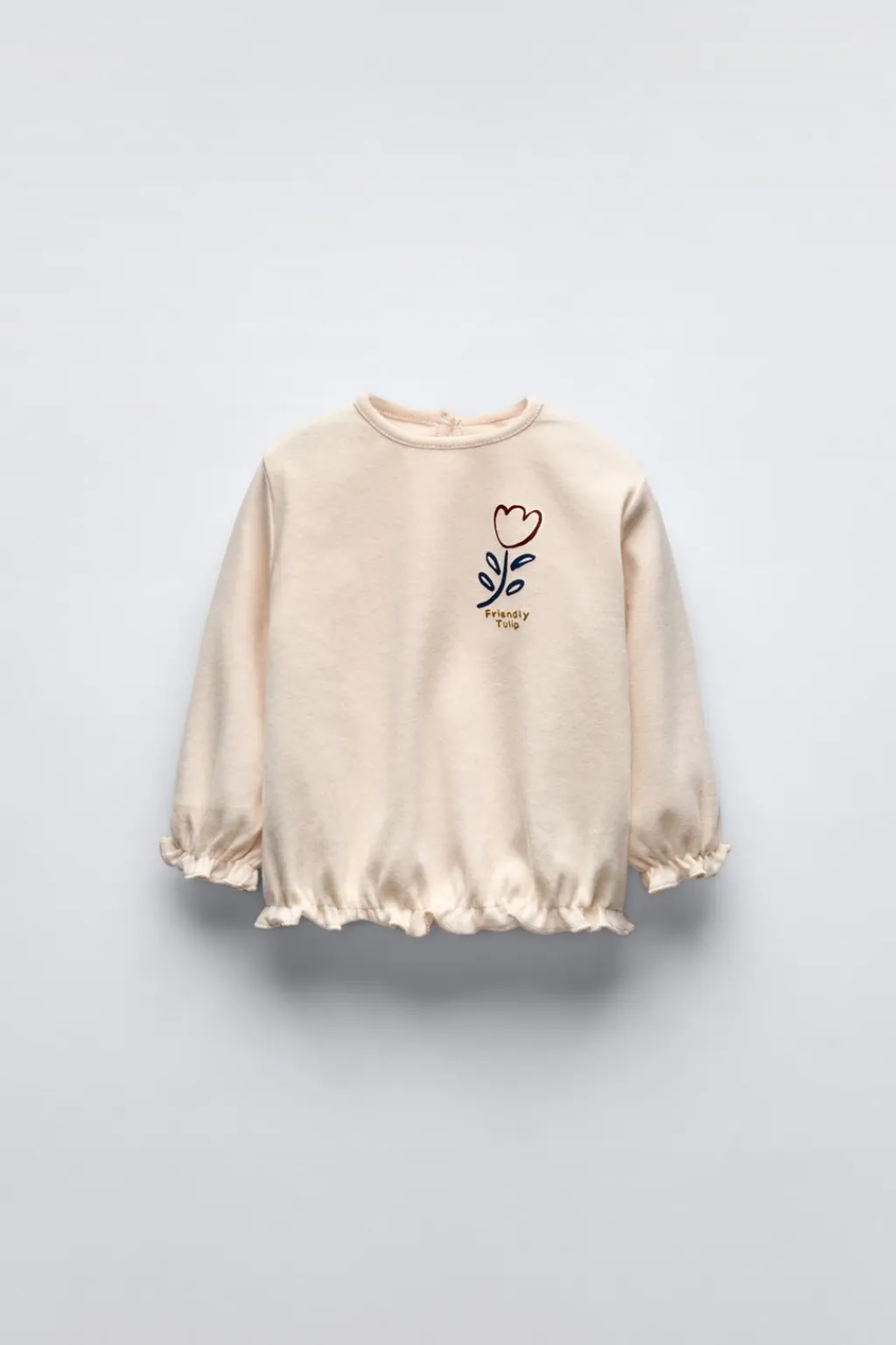 Camiseta con cuello redondo y manga larga acabada en goma. Cierre tipo lágrima con botón en espalda. Estampado flor en delantero. Bajo acabado en volante y goma.