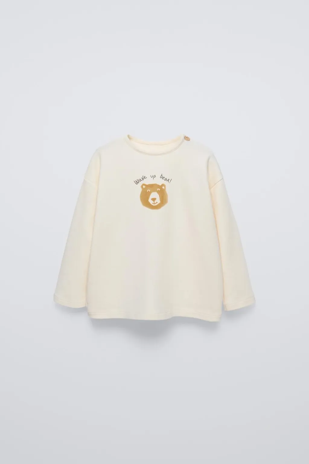 Camiseta con cuello redondo y manga larga. Cierre botón en hombro. Detalle oso con flock en pechera y estampado en espalda.