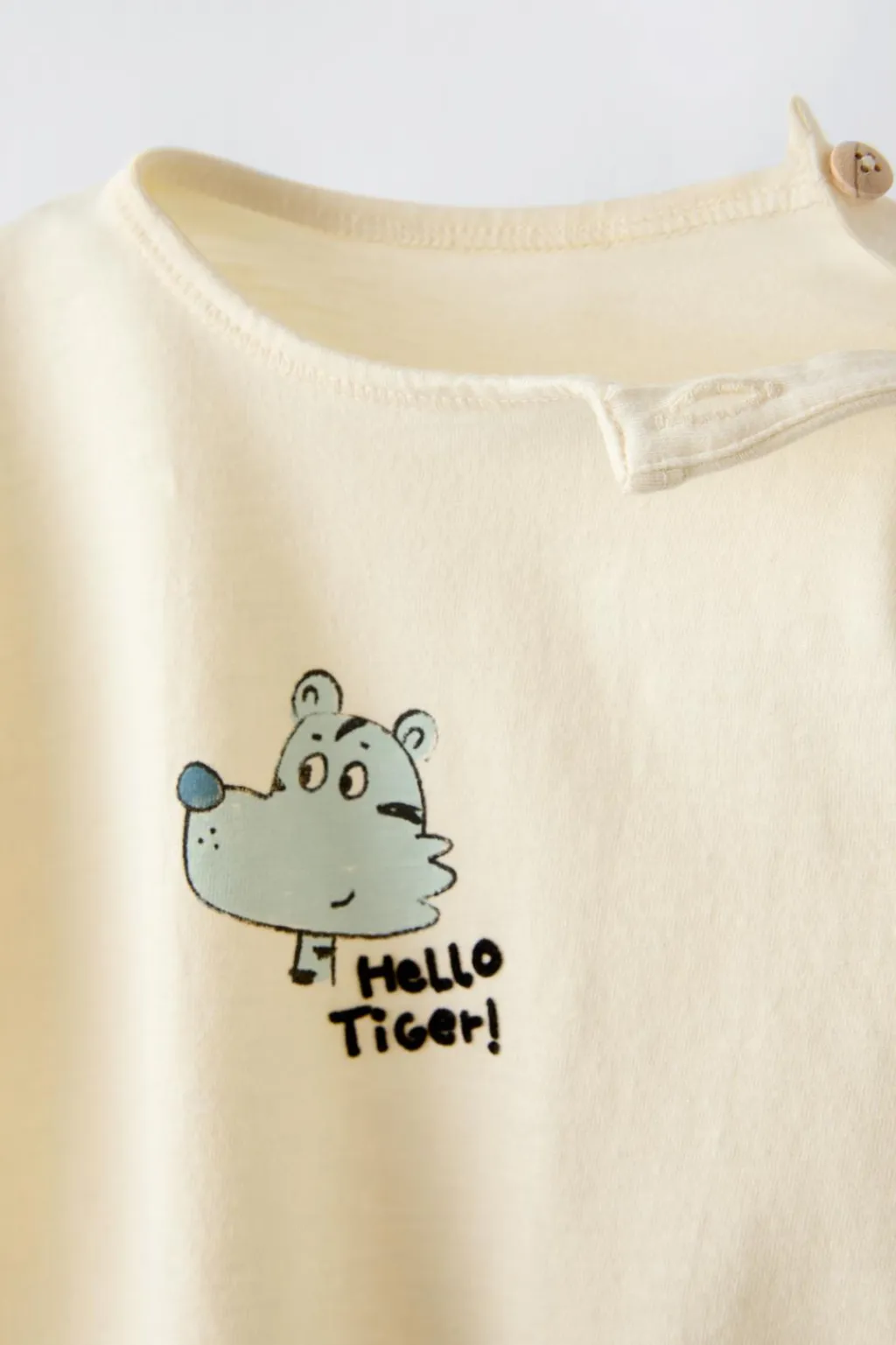 Camiseta con cuello redondo y manga larga. Cierre botón en hombro. Estampado en delantero con detalle flock.