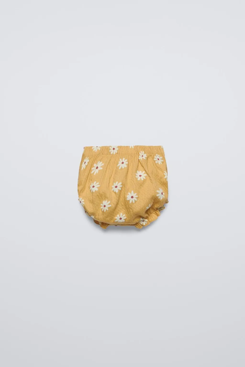 Braguita con cinturilla elástica y bajo con gomas acabados en volantes. Estampado margaritas.