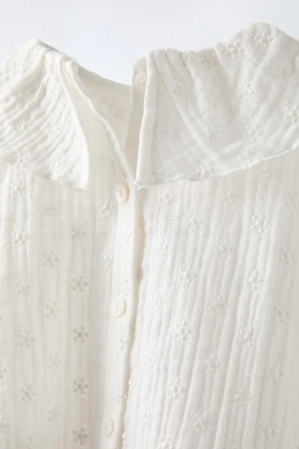Conjunto dos piezas. Blusa con cuello bobo y manga corta acabada en goma. Cierre botonadura en espalda. Braguita con cinturilla elástica. Acabados en rizo.