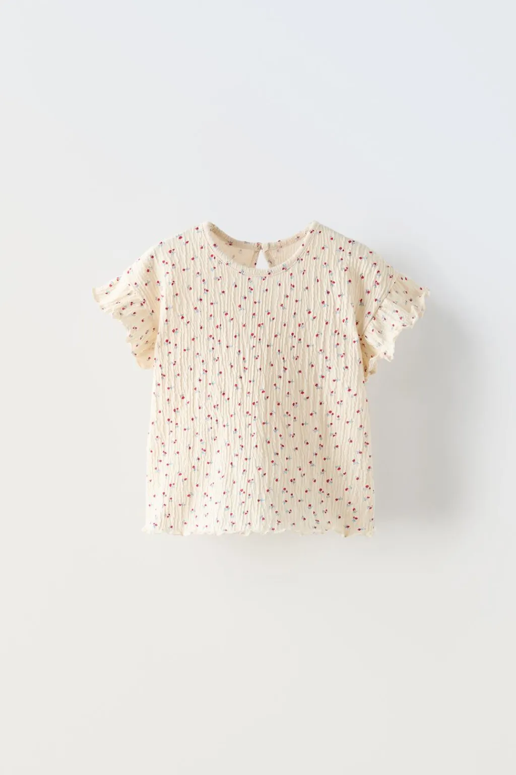 Camiseta con cuello redondo y manga corta acabada en volantes. Cierre en lágrima con botón en espalda. Acabados en rizo.