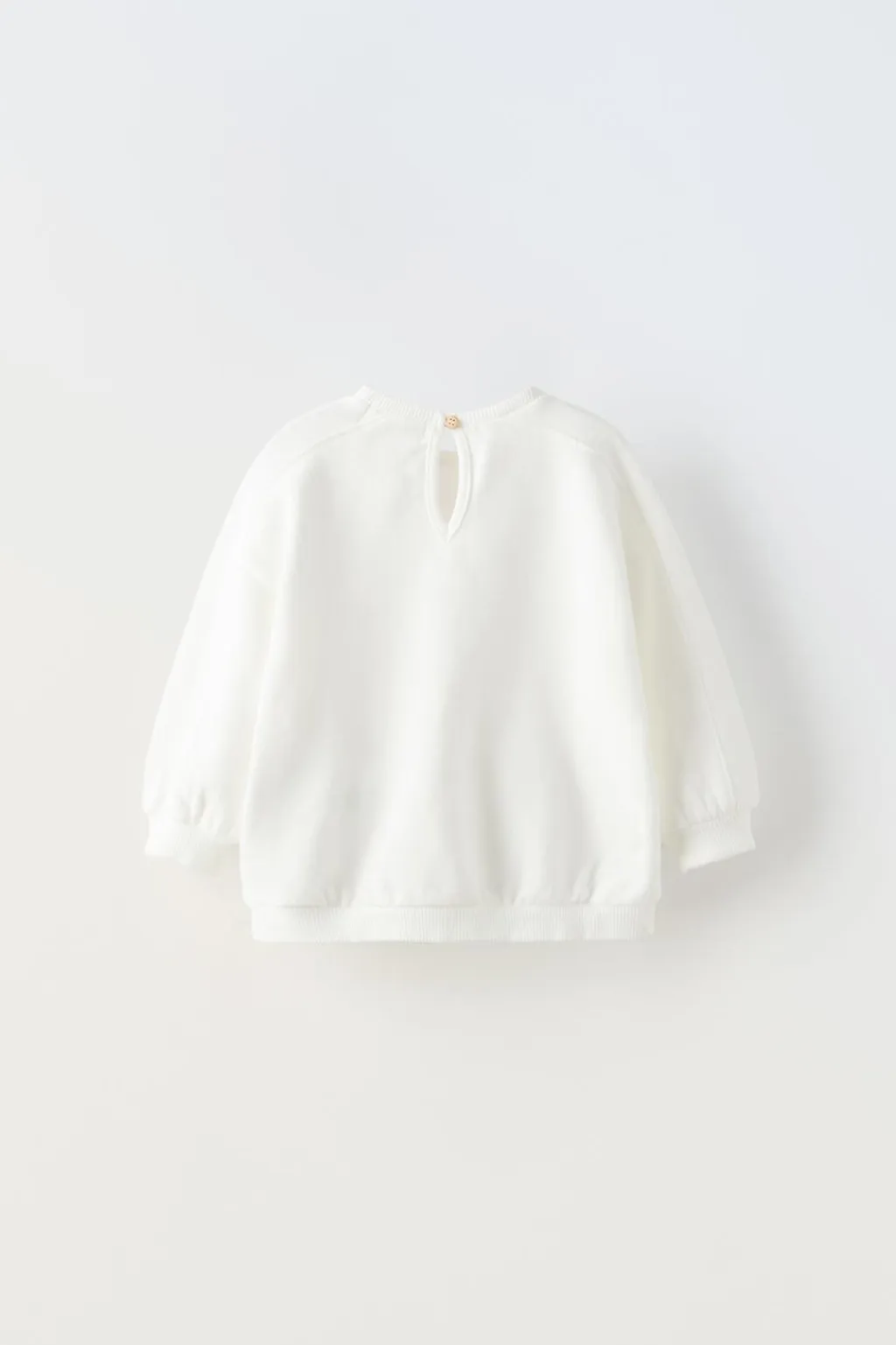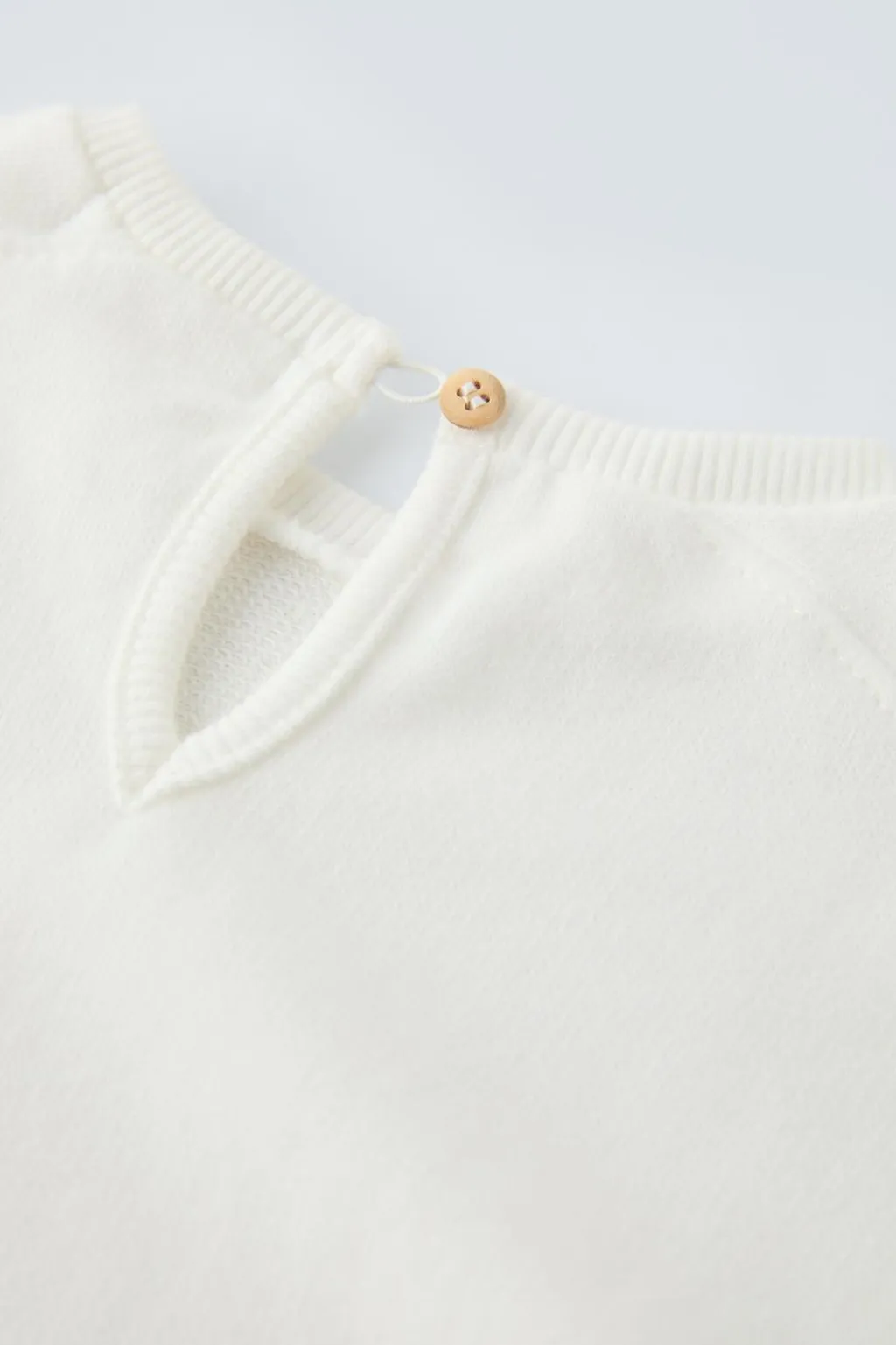 Sudadera con cuello redondo y manga larga. Acabados en rib. Cierre en lágrima con botón en espalda.