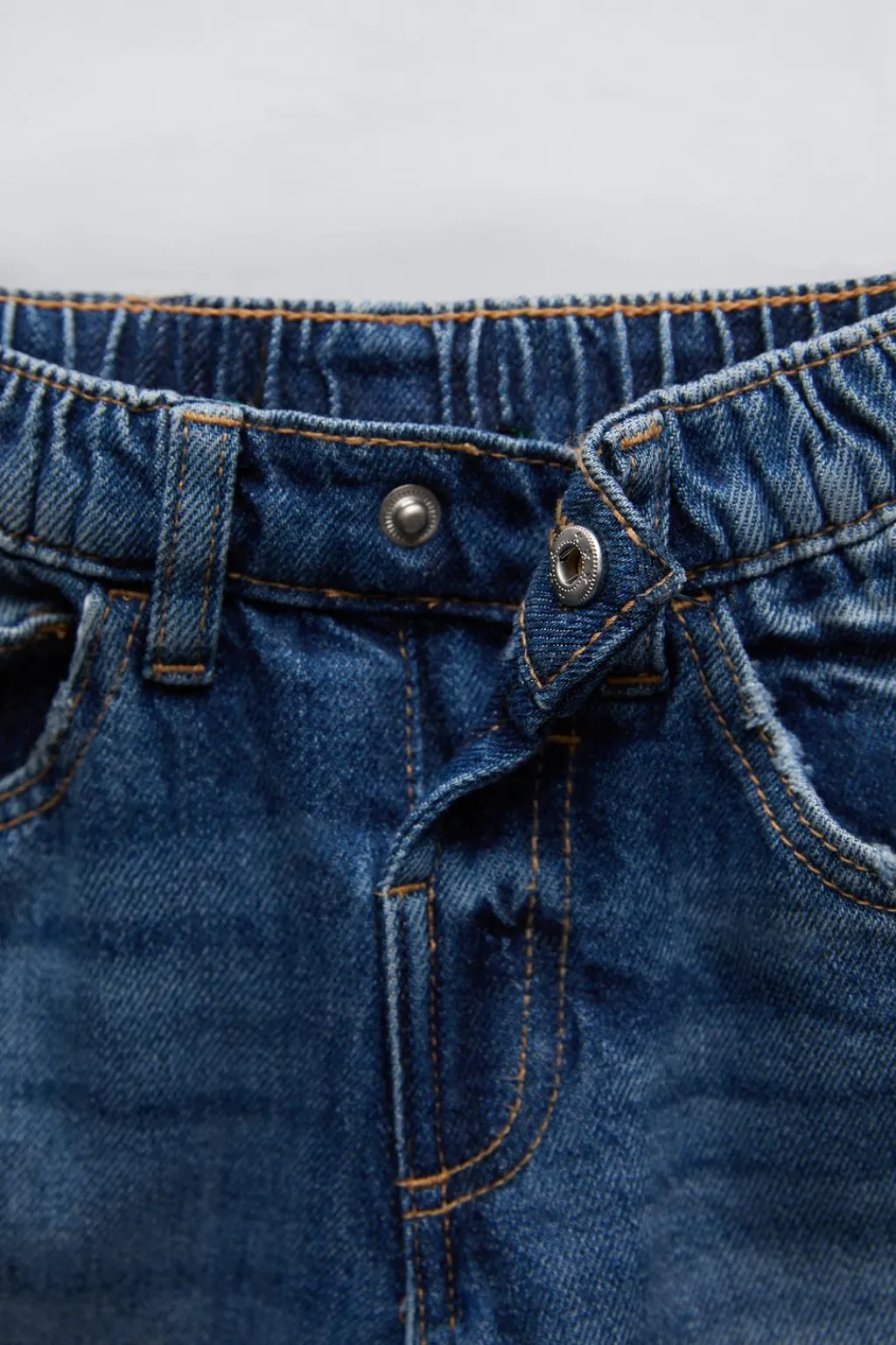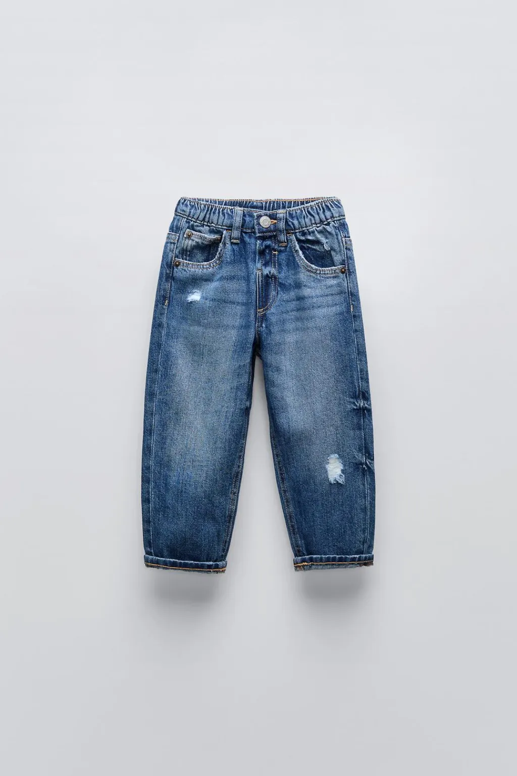 Jeans con cinturilla elástica y cierre botón frontal. Bolsillos delanteros y de tipo plastrón en espalda. Detalle rotos.