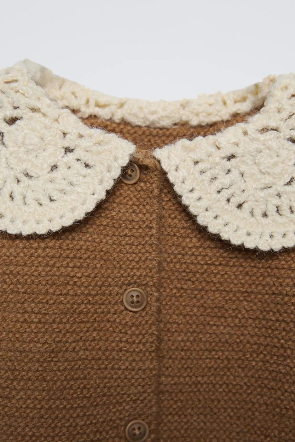 Chaqueta con cuello bobo en tejido crochet y manga larga. Cierre botonadura frontal.