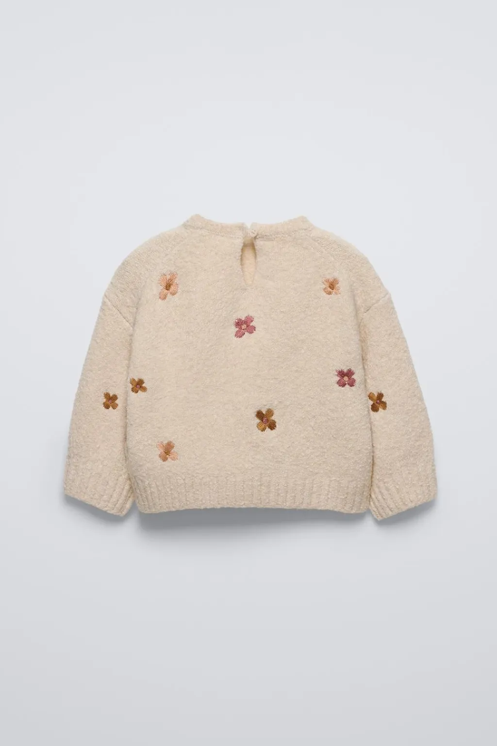 Jersey con cuello redondo y manga larga, Cierre tipo lágrima con botón en espalda. Detalle flores bordadas.