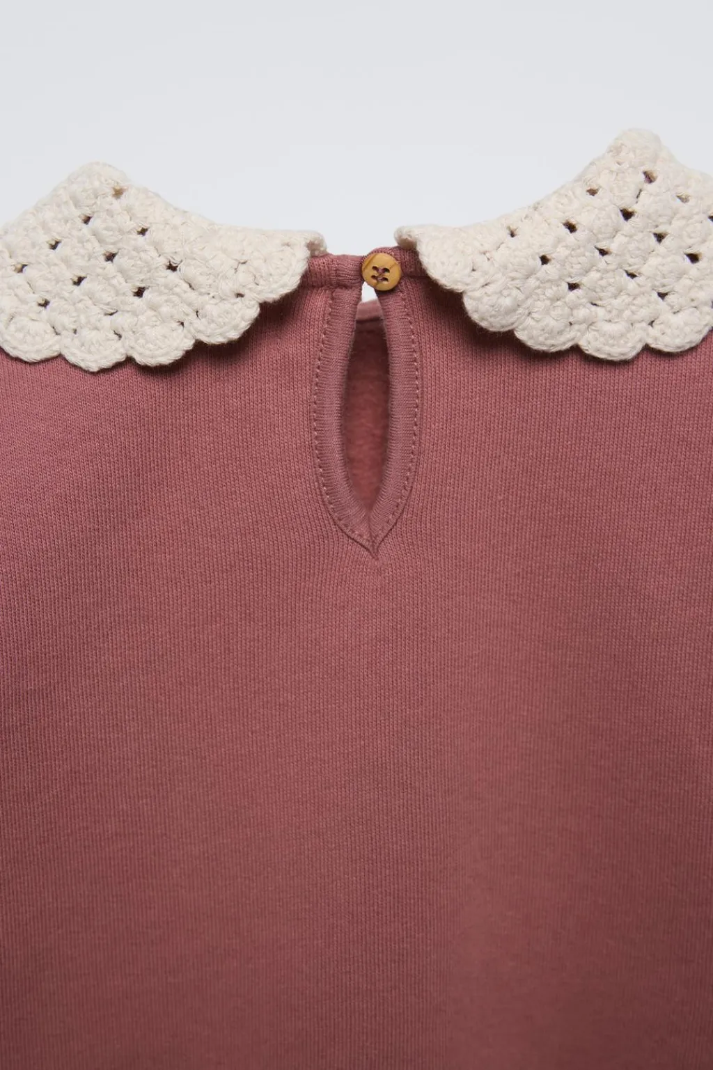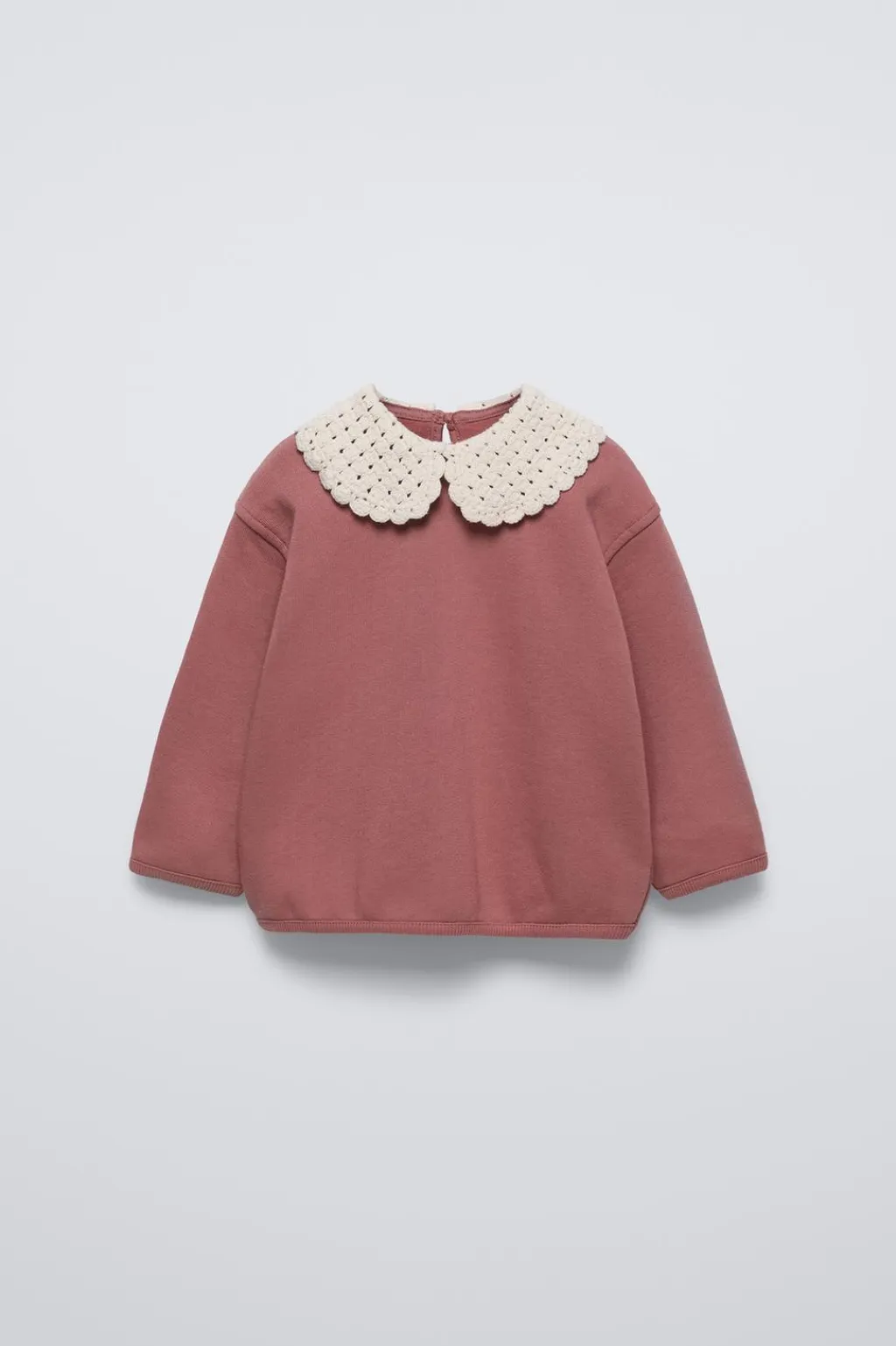 Sudadera con cuello bobo de crochet y manga larga acaba en puño. Cierre con botón tipo lágrima en espalda. Interior en una calidad cálida y suave.