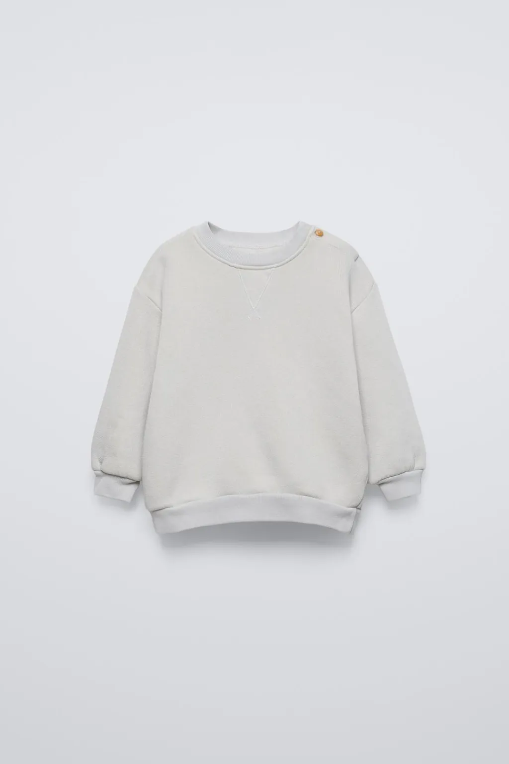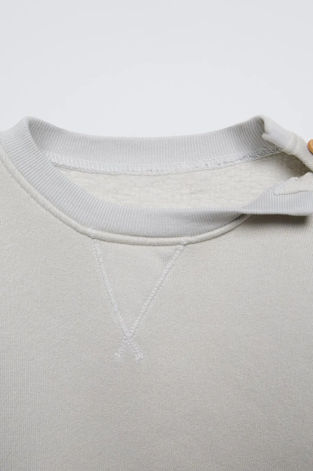 Sudadera con cuello redondo y manga larga. Cierre con botones en hombro. Acabados en rib.