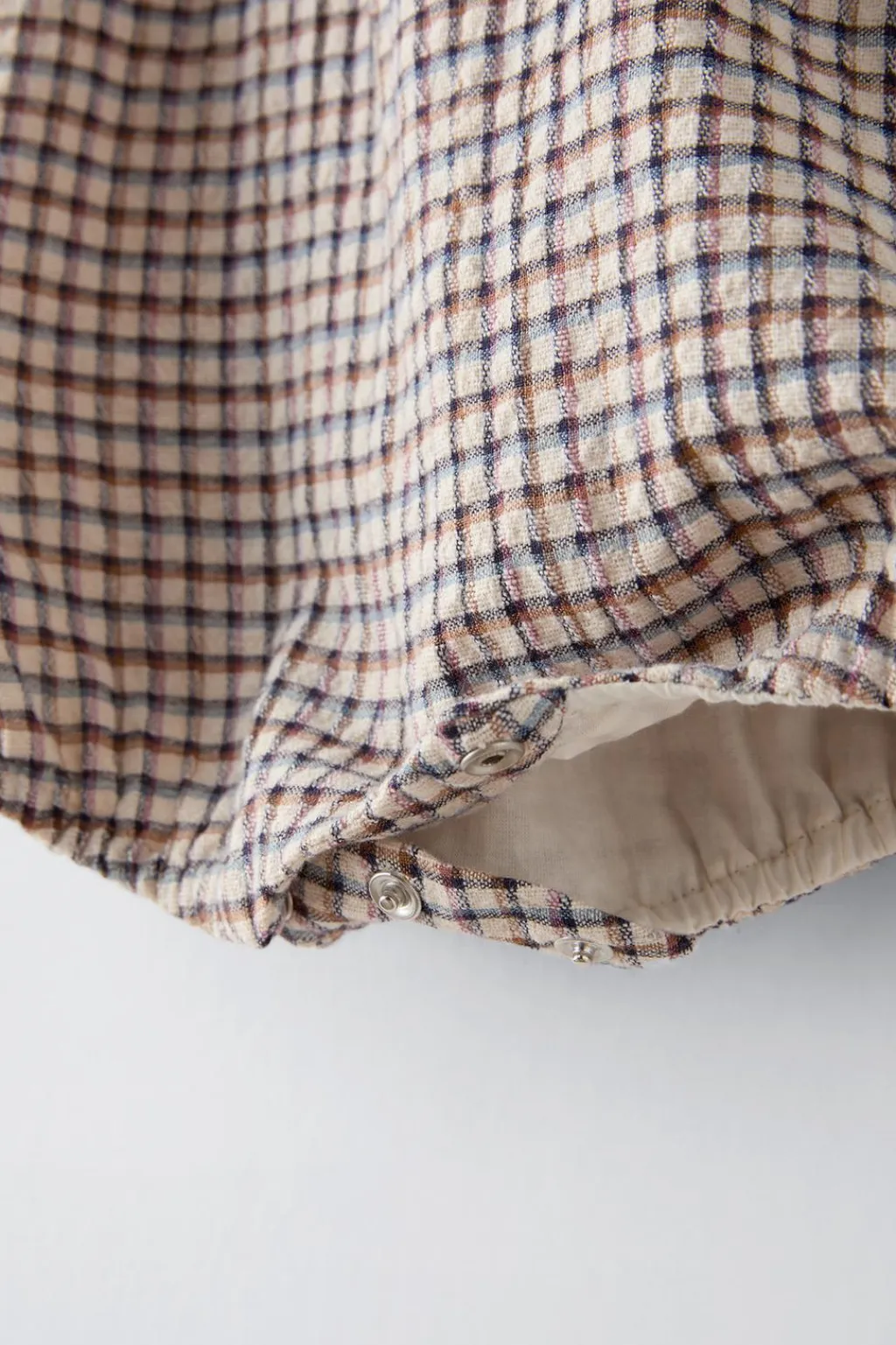 Pelele con cuello recto y tirantes con cierre botón frontal. Cierre botones presión en bajo con goma.