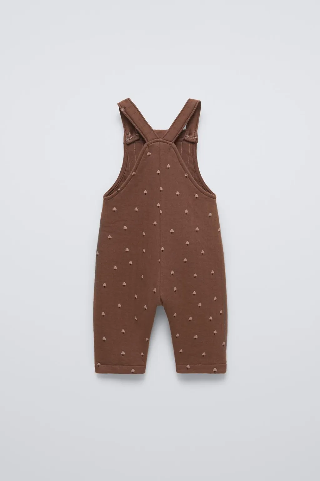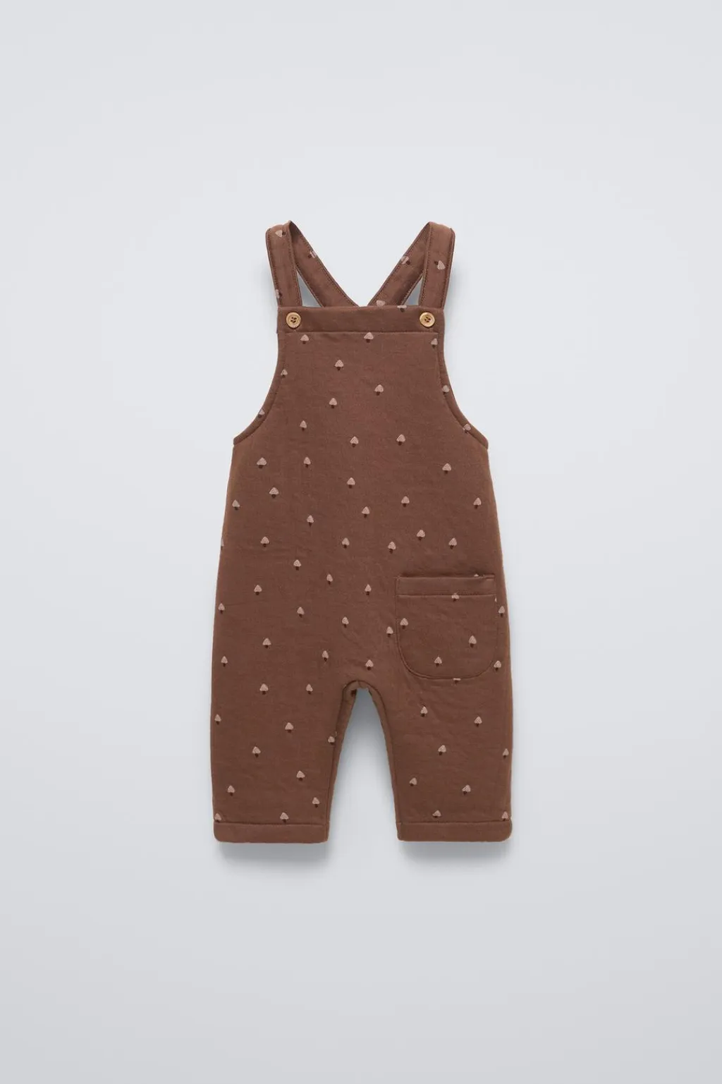 Peto con cuello recto y tirantes con cierre botones frontal. Bolsillo de tipo plastrón en delantero. Estampado setas.