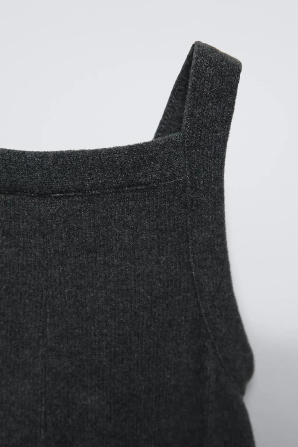 Peto con cuello recto y tirantes. Detalle goma en espalda.