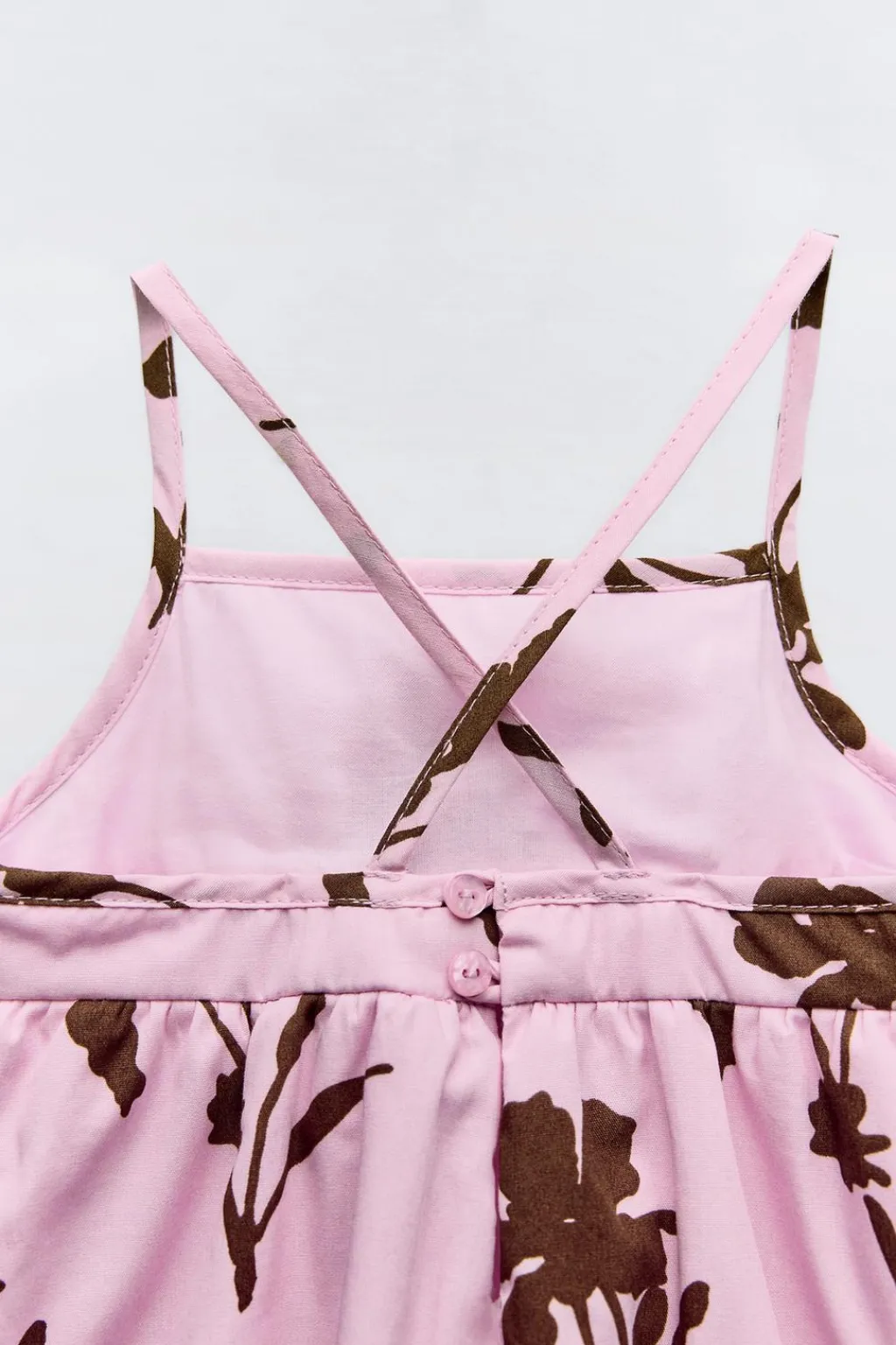 Vestido con cuello recto y tirantes cruzados en espalda. Bajo acabado en globo. Estampado flores.