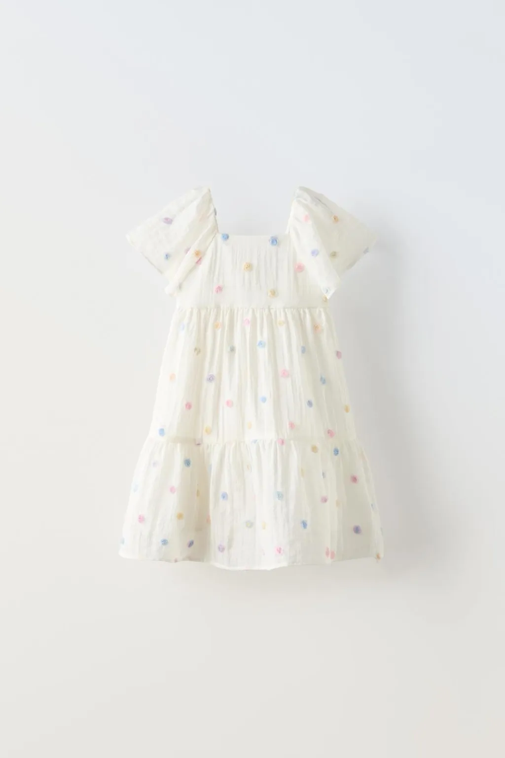 Vestido con cuello recto y manga corta. Cierre con botones en espalda. Aplique flores all over.